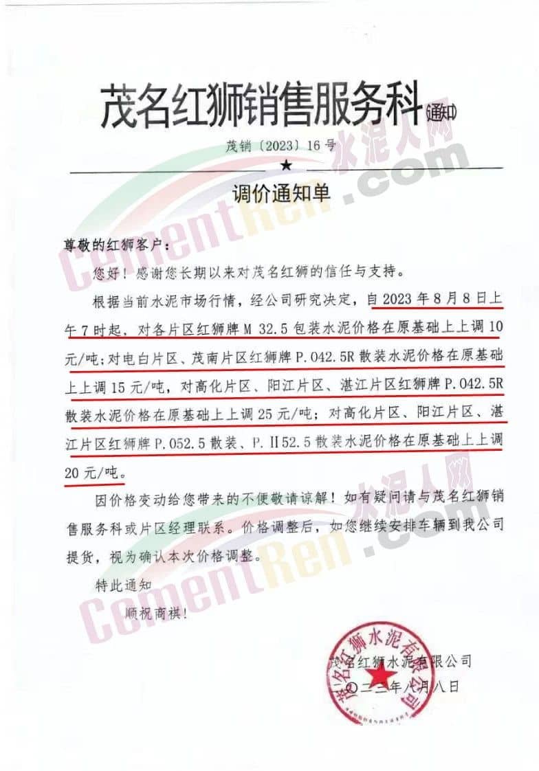水泥人網(wǎng)通訊員消息:日前,茂名紅獅銷售服務(wù)科發(fā)通知稱,根據(jù)當前水泥市場行情,經(jīng)公司研究決定,自2023年8月8日上午7時起,對各片區(qū)紅獅牌M32.5包裝水泥價格在原基礎(chǔ)上上調(diào)10元/噸;對電白片區(qū)、茂南片區(qū)紅獅牌PO42.5R散裝水泥價格在原基礎(chǔ)上上調(diào)15元/噸;對高化片區(qū)、陽江片區(qū)、湛江片區(qū)紅獅牌P.O42.5R散裝水泥價格在原基礎(chǔ)上上調(diào)25元/噸;對高化片區(qū)、陽江片區(qū)、湛江片區(qū)紅獅牌P.O52.5散裝、PII52.5散裝水泥價格在原基礎(chǔ)上上調(diào)20元/噸。