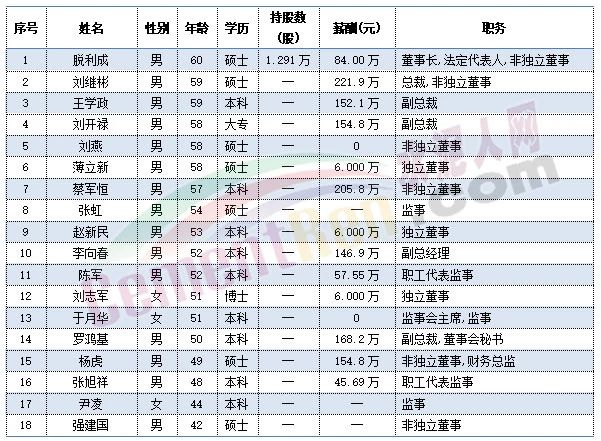 祁連山董事長脫利成今年60歲,總裁劉繼彬、副總裁王學(xué)政今年59歲,副總裁劉開祿今年58歲。