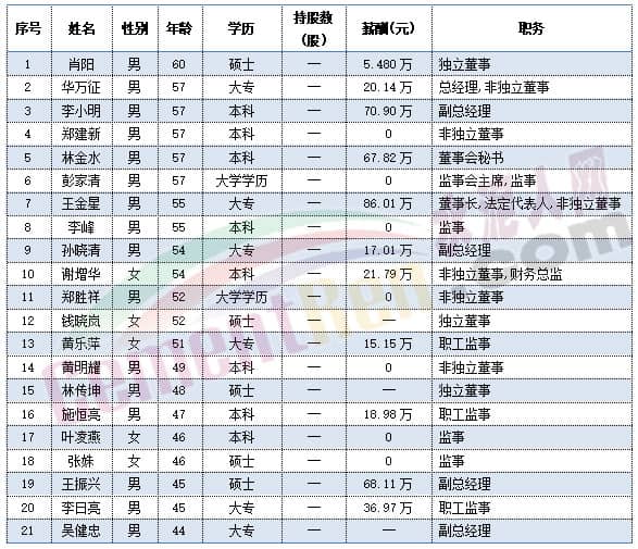福建水泥獨(dú)立董事肖陽今年60歲,總經(jīng)理華萬征,副總經(jīng)理李小明,董事會秘書林金水以及監(jiān)事會主席彭家清今年都是57歲。