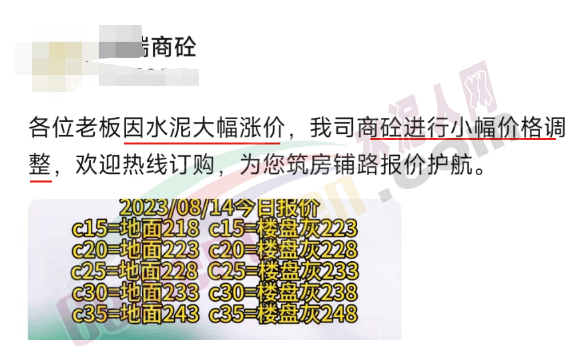 某商砼企業(yè)通知,因水泥大幅漲價(jià),商砼進(jìn)行小幅價(jià)格調(diào)整。調(diào)整后C30地面233元/方,樓盤灰238元/方。