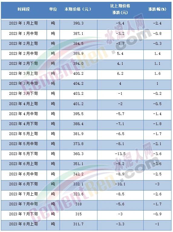 8月14日,國家統(tǒng)計(jì)局發(fā)布的2023年8月上旬流通領(lǐng)域重要生產(chǎn)資料市場(chǎng)價(jià)格變動(dòng)情況顯示,普通硅酸鹽水泥(P.O42.5散裝)水泥報(bào)價(jià)311.7元/噸,且為自5月上旬以來第10次突破年內(nèi)最低價(jià)。