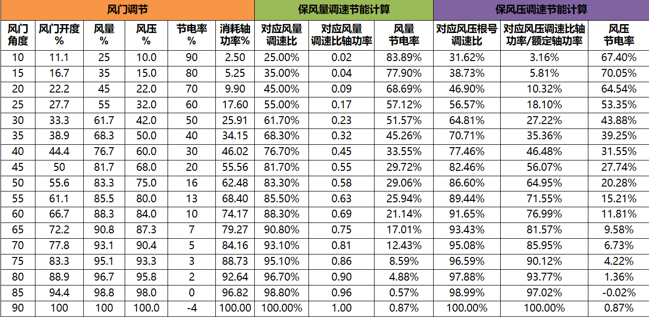 相較于工頻轉(zhuǎn)速,65度風(fēng)門(mén)開(kāi)度節(jié)電率約為15.5%。