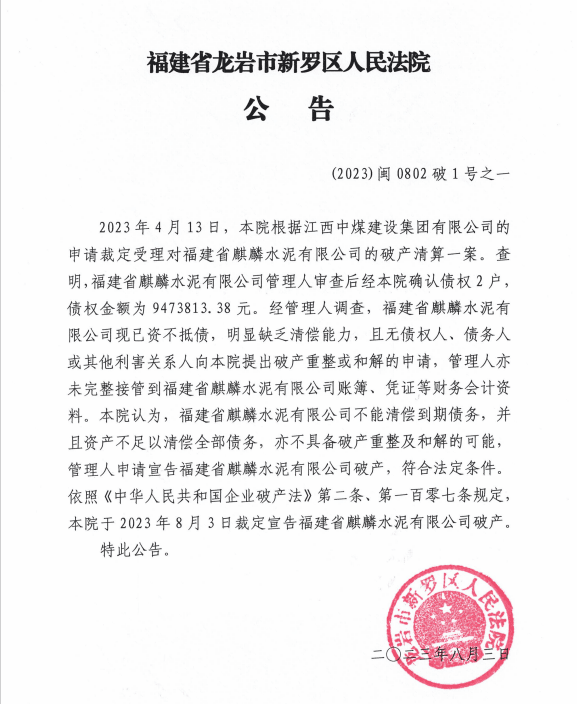 8月4日,福建省龍巖市新羅區(qū)人民法院公告,福建省麒麟水泥有限公司不能清償?shù)狡趥鶆?wù),并且資產(chǎn)不足以清償全部債務(wù),亦不具備破產(chǎn)重整及和解的可能,管理人申請(qǐng)宣告福建省麒麟水泥有限公司破產(chǎn),本院于裁定宣告福建省麒麟水泥有限公司破產(chǎn)。