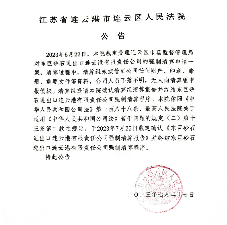 7月27日,江蘇省連云港市連云區(qū)人民法院公告,2023年5月22日,本院裁定受理連云區(qū)市場(chǎng)監(jiān)督管理局對(duì)東巨砂石進(jìn)出口連云港有限責(zé)任公司的強(qiáng)制清算申請(qǐng)一案,清算過程中,清算組未接管到公司任何財(cái)產(chǎn)、印章、賬冊(cè)、重要文件等資料,公司人員下落不明,無人向清算組申報(bào)債權(quán)。清算組提請(qǐng)本院確認(rèn)清算組清算報(bào)告并終結(jié)東巨砂石進(jìn)出口連云港有限責(zé)任公司強(qiáng)制清算程序。本院于2023年7月25日裁定確認(rèn)《東巨砂石進(jìn)出口連云港有限責(zé)任公司強(qiáng)制清算報(bào)告》并終結(jié)東巨砂石進(jìn)出口連云港有限責(zé)任公司強(qiáng)制清算程序。