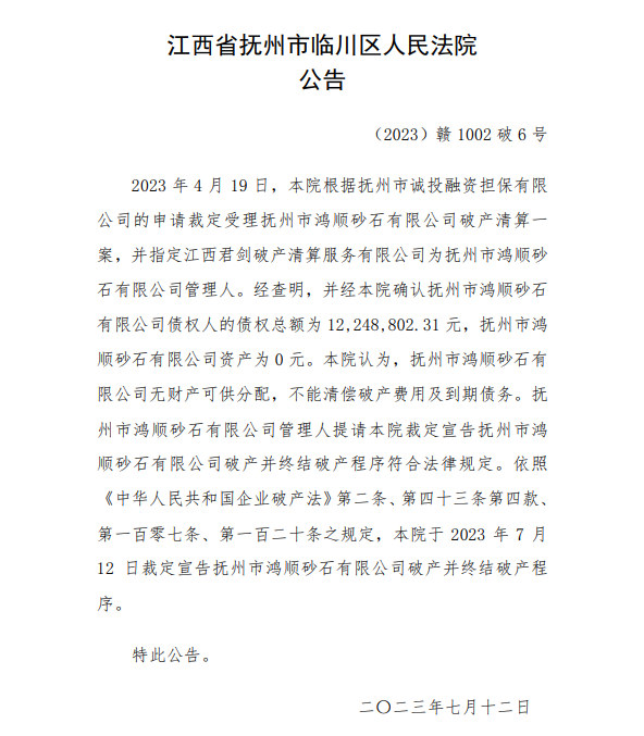 7月12日,江西省撫州市臨川區(qū)人民法院公告,本院認(rèn)為,撫州市鴻順砂石有限公司無財(cái)產(chǎn)可供分配,不能清償破產(chǎn)費(fèi)用及到期債務(wù)。撫州市鴻順砂石有限公司管理人提請(qǐng)本院裁定宣告撫州市鴻順砂石有限公司破產(chǎn)并終結(jié)破產(chǎn)程序符合法律規(guī)定。本院于2023年7月12日裁定宣告撫州市鴻順砂石有限公司破產(chǎn)并終結(jié)破產(chǎn)程序。