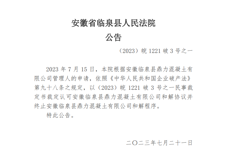 7月21日,安徽省臨泉縣人民法院公告,本院根據(jù)安徽臨泉縣鼎力混凝土有限公司管理人的申請(qǐng),依照《中華人民共和國(guó)企業(yè)破產(chǎn)法》第九十八條之規(guī)定,以(2023)皖 1221 破 3 號(hào)之一民事裁定書裁定認(rèn)可安徽臨泉縣鼎力混凝土有限公司和解協(xié)議并終止安徽臨泉縣鼎力混凝土有限公司和解程序.