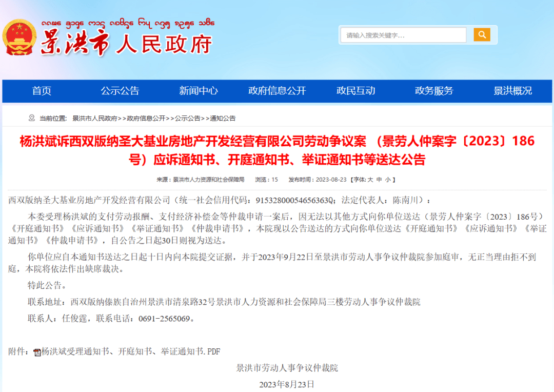 近日,景洪市人民政府發(fā)布公告,因楊洪斌的支付勞動(dòng)報(bào)酬、支付經(jīng)濟(jì)補(bǔ)償金等仲裁申請(qǐng)一案無(wú)法以其他方式向西雙版納圣大基業(yè)房地產(chǎn)開(kāi)發(fā)經(jīng)營(yíng)有限公司送達(dá)《開(kāi)庭通知書(shū)》《應(yīng)訴通知書(shū)》《舉證通知書(shū)》《仲裁申請(qǐng)書(shū)》,景洪市勞動(dòng)人事?tīng)?zhēng)議仲裁院現(xiàn)以公告送達(dá)的方式該企業(yè)送達(dá)。