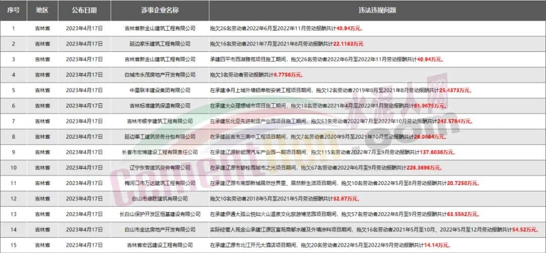 吉林省15家房企、建企欠薪被通報(bào)或處罰,涉及金額775.96萬(wàn)元