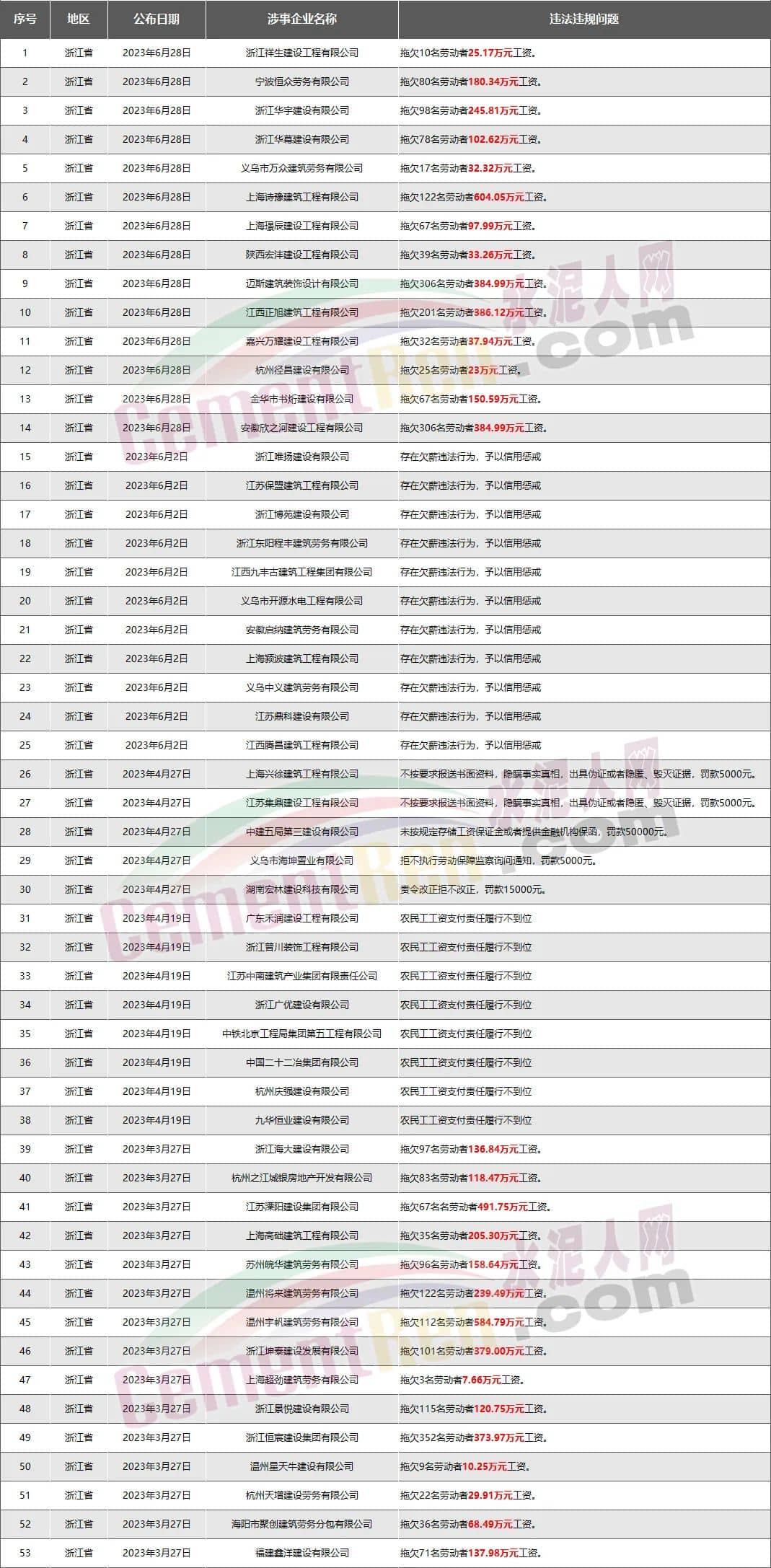 浙江省53家房企、建企欠薪被通報(bào)或處罰,涉及金額5752萬(wàn)元
