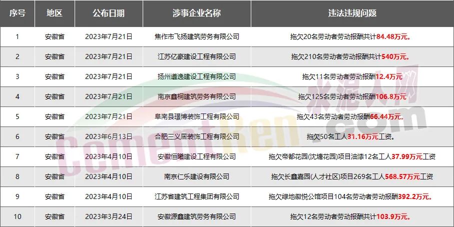 安徽省10家房企、建企欠薪被通報(bào)或處罰,涉及金額1944萬(wàn)元