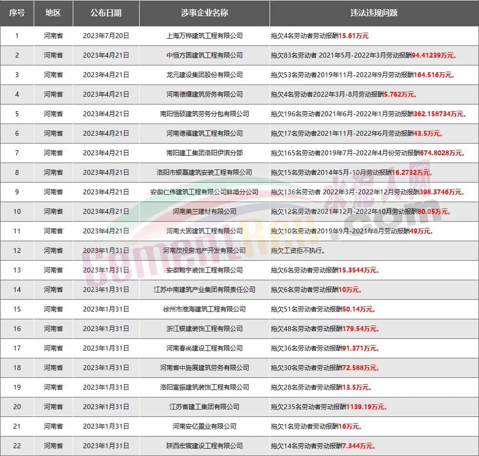 河南省22家房企、建企欠薪被通報(bào)或處罰,涉及金額3499.43萬(wàn)元