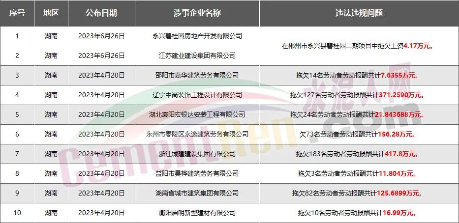 湖南省10家房企、建企欠薪被通報(bào)或處罰,涉及金額1133.44萬(wàn)元