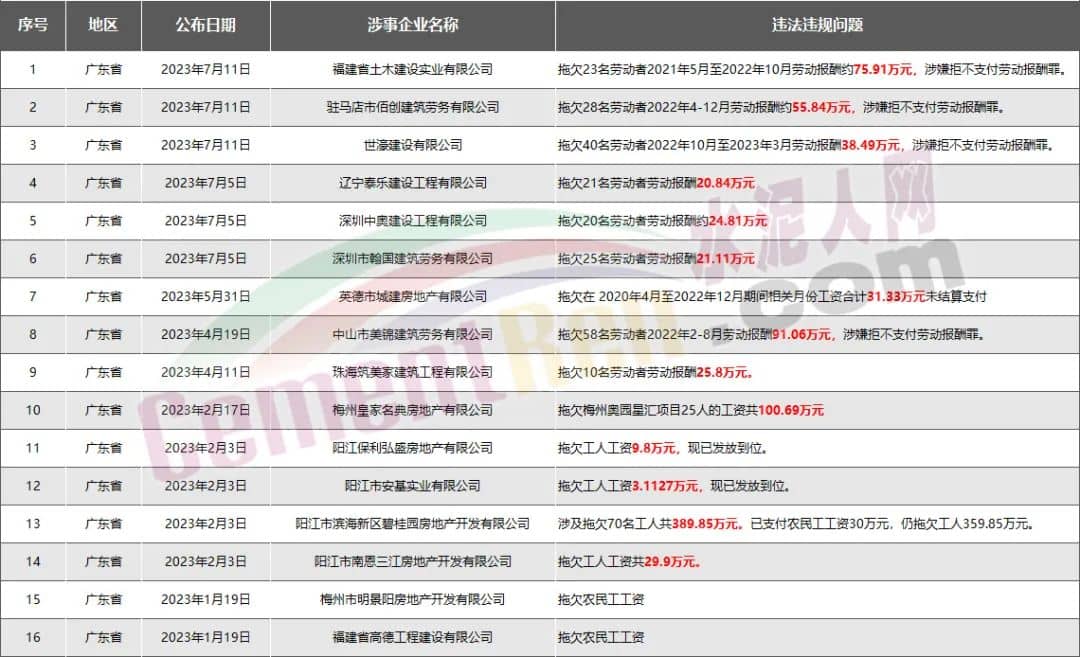 廣東省16家房企、建企欠薪被通報(bào)或處罰,涉及金額918.51萬(wàn)元