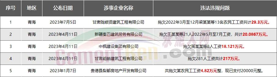 青海省5家房企、建企欠薪被通報(bào)或處罰,涉及金額289.32萬(wàn)元