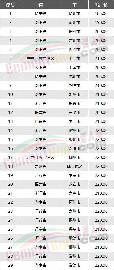 數(shù)據(jù)顯示,29個地區(qū)水泥出廠價格在220元/噸以下。其中湖南區(qū)域市場占比最多,涉及衡陽市、株洲市、益陽市、長沙市、湘潭市、永州市、邵陽市、婁底市、懷化市、郴州市、常德市11個地區(qū);某湖南市場人員反饋,目前湖南地區(qū)水泥價格已跌至近5年最低值了,且沒有明顯好轉(zhuǎn)現(xiàn)象,當?shù)睾芏嗥髽I(yè)今年都沒開窯,熟料都是外購的,水泥窯運轉(zhuǎn)率只有40%,并且價格隨時都在變。