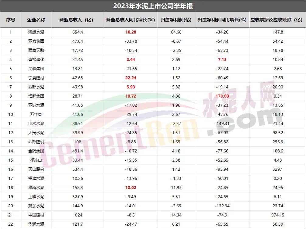 通過(guò)分析已發(fā)布的22家水泥上市公司的2023年半年業(yè)績(jī)報(bào)告,水泥人網(wǎng)將各大水泥上市公司的營(yíng)業(yè)總收入、凈利潤(rùn)、應(yīng)收票據(jù)及應(yīng)收賬款排名整理如下: