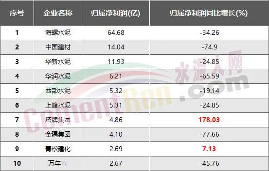 凈利潤(rùn)TOP10:海螺水泥凈利潤(rùn)遙遙領(lǐng)先