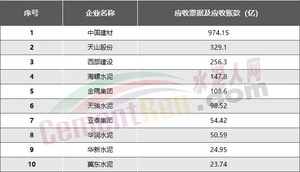 應(yīng)收票據(jù)及應(yīng)收賬款排名前十為:中國(guó)建材、天山股份、西部建設(shè)、海螺水泥、金隅集團(tuán)、天瑞水泥、亞泰集團(tuán)、華潤(rùn)水泥、華新水泥、冀東水泥。