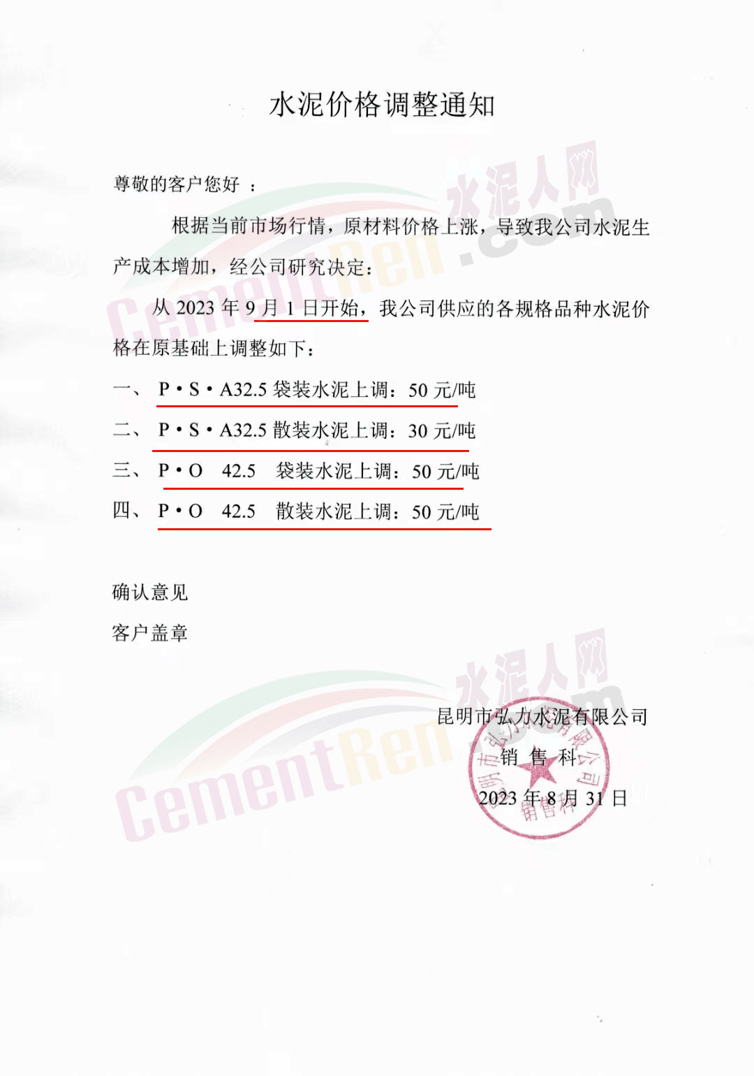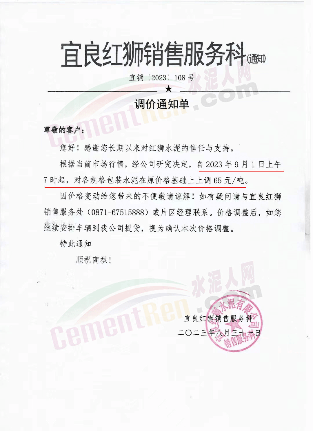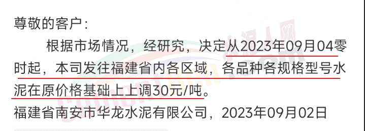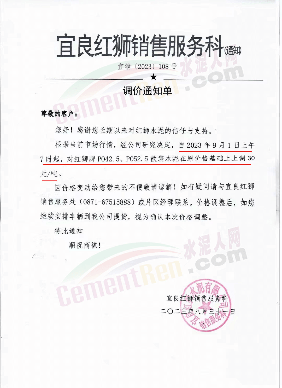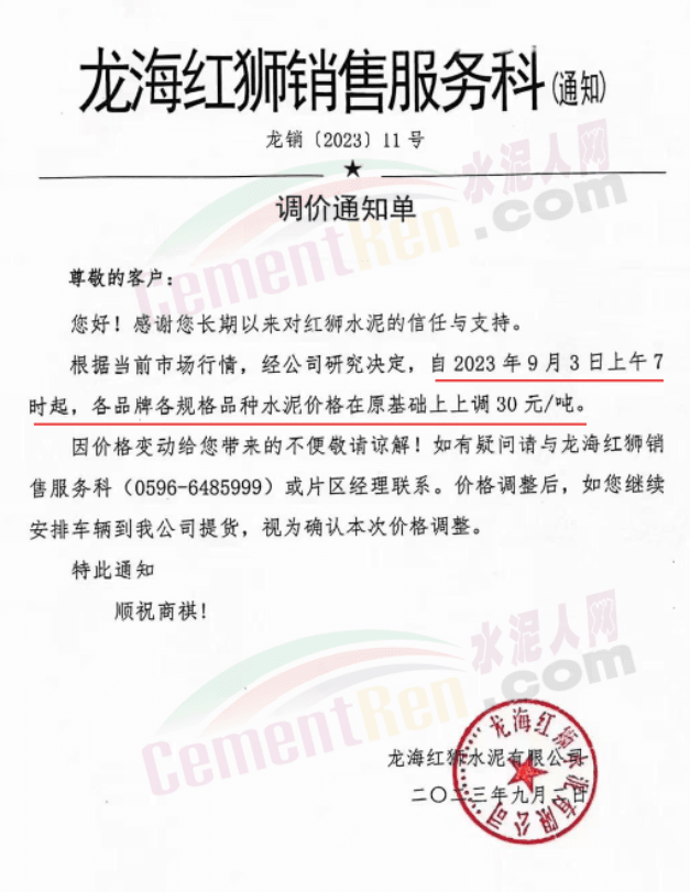 龍海紅獅、大田紅獅銷售服務(wù)科通知,根據(jù)當(dāng)前市場(chǎng)行情,經(jīng)公司研究決定,自2023年9月3日上午7時(shí)起,各品牌各規(guī)格品種水泥價(jià)格在原基礎(chǔ)上上調(diào)30元/噸。