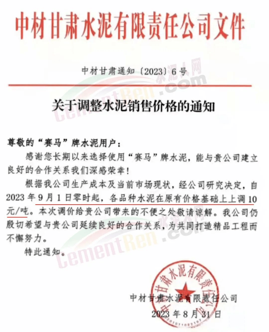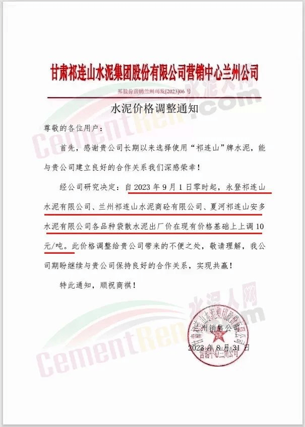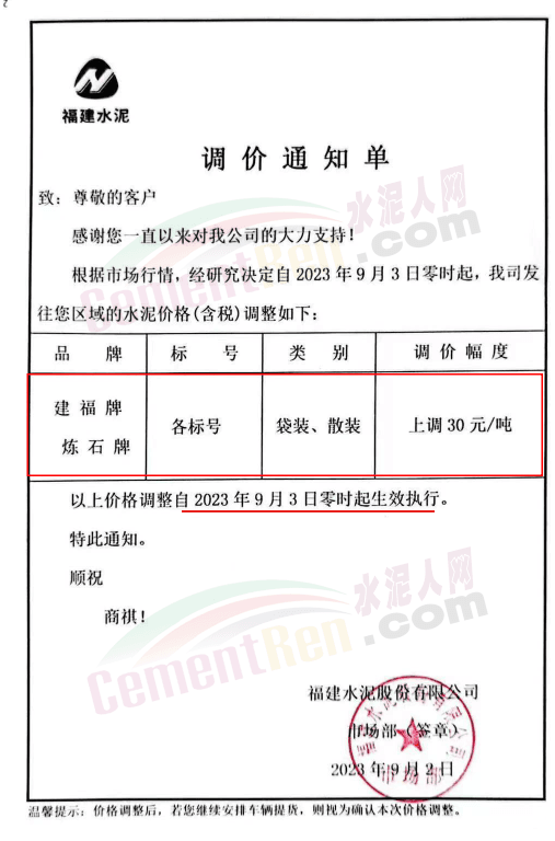 福建水泥股份有限公司通知,根據(jù)市場(chǎng)行情,經(jīng)研究決定自2023年9月3日0時(shí)起,公司“建福牌、煉石牌”發(fā)往各區(qū)域的水泥含稅價(jià)格上調(diào)30元/噸。