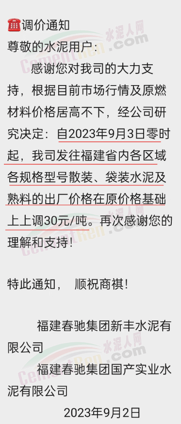 福建春馳集團(tuán)新豐水泥有限公司 福建春馳集團(tuán)國(guó)產(chǎn)實(shí)業(yè)水泥有限公司通知,根據(jù)目前市場(chǎng)行情及原燃材料價(jià)格居高不下,經(jīng)公司研究決定:自2023年9月3日0時(shí)起,公司發(fā)往福建省內(nèi)各區(qū)域各規(guī)格型號(hào)散裝、袋裝水泥及熟料的出廠價(jià)格在原價(jià)格基礎(chǔ)上上調(diào)30元/噸。