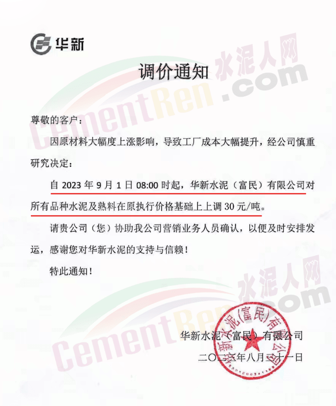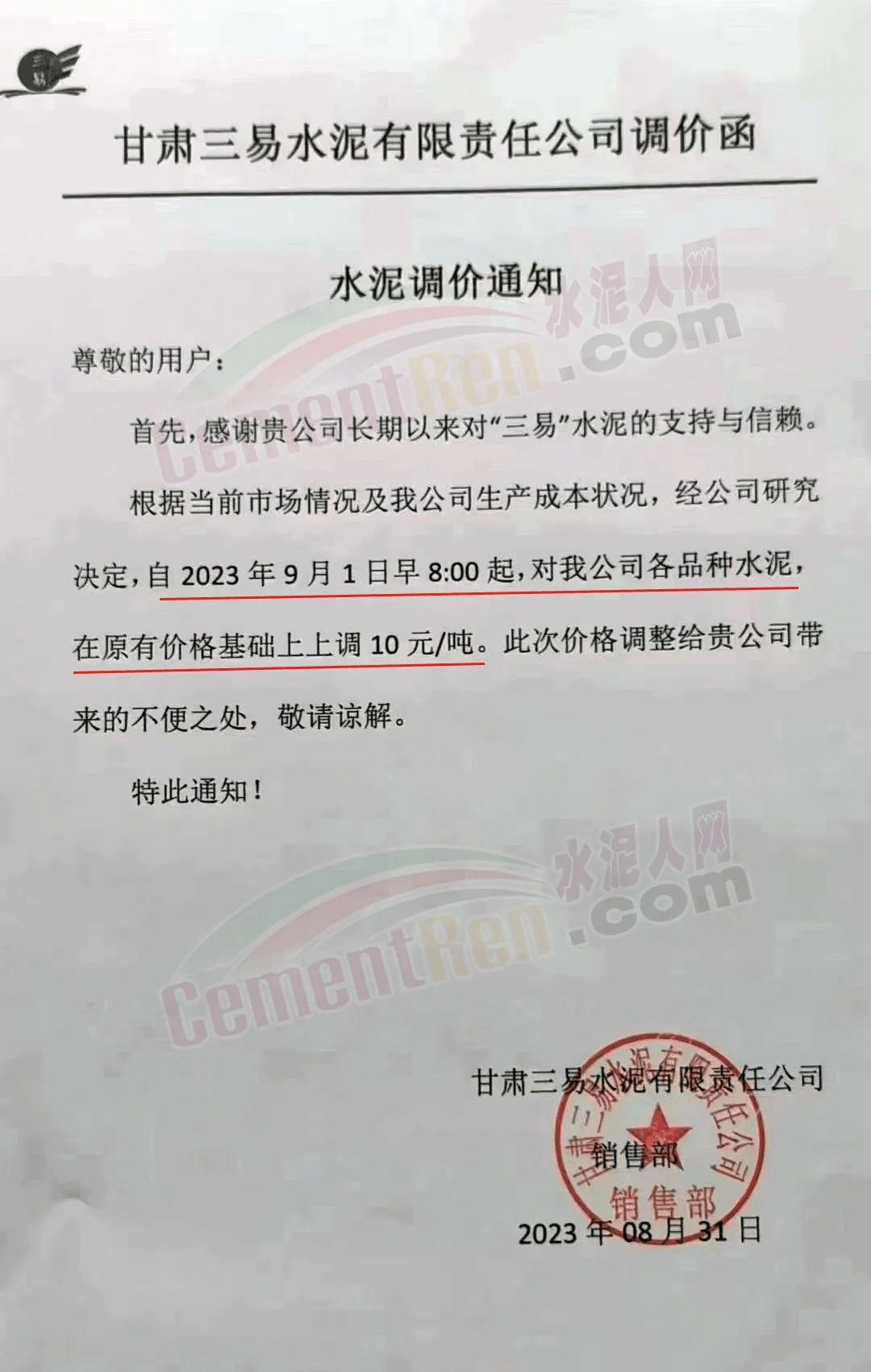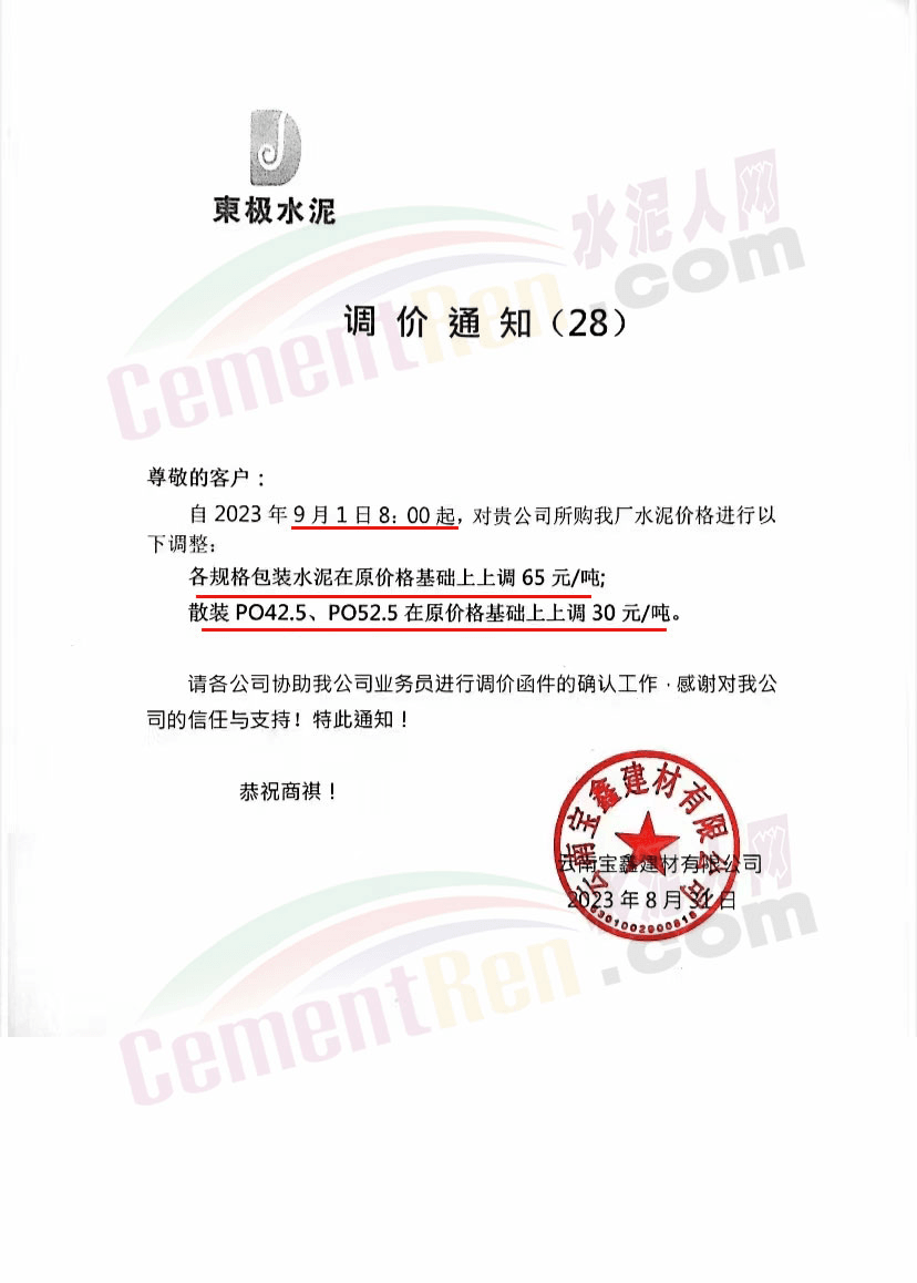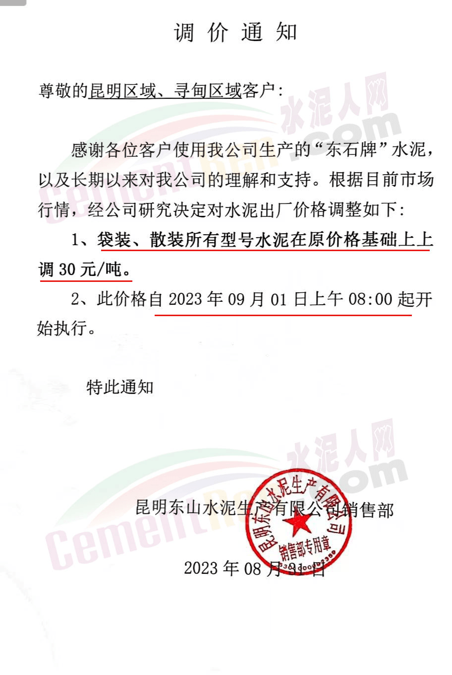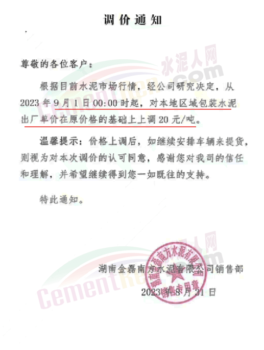 福建三明南方水泥有限公司通知,根據(jù)目前市場(chǎng)行情,經(jīng)公司研究決定,自2023年9月3日零時(shí)起公司各品種袋裝、散裝水泥出廠價(jià)在原有基礎(chǔ)上上調(diào)30元/噸。
