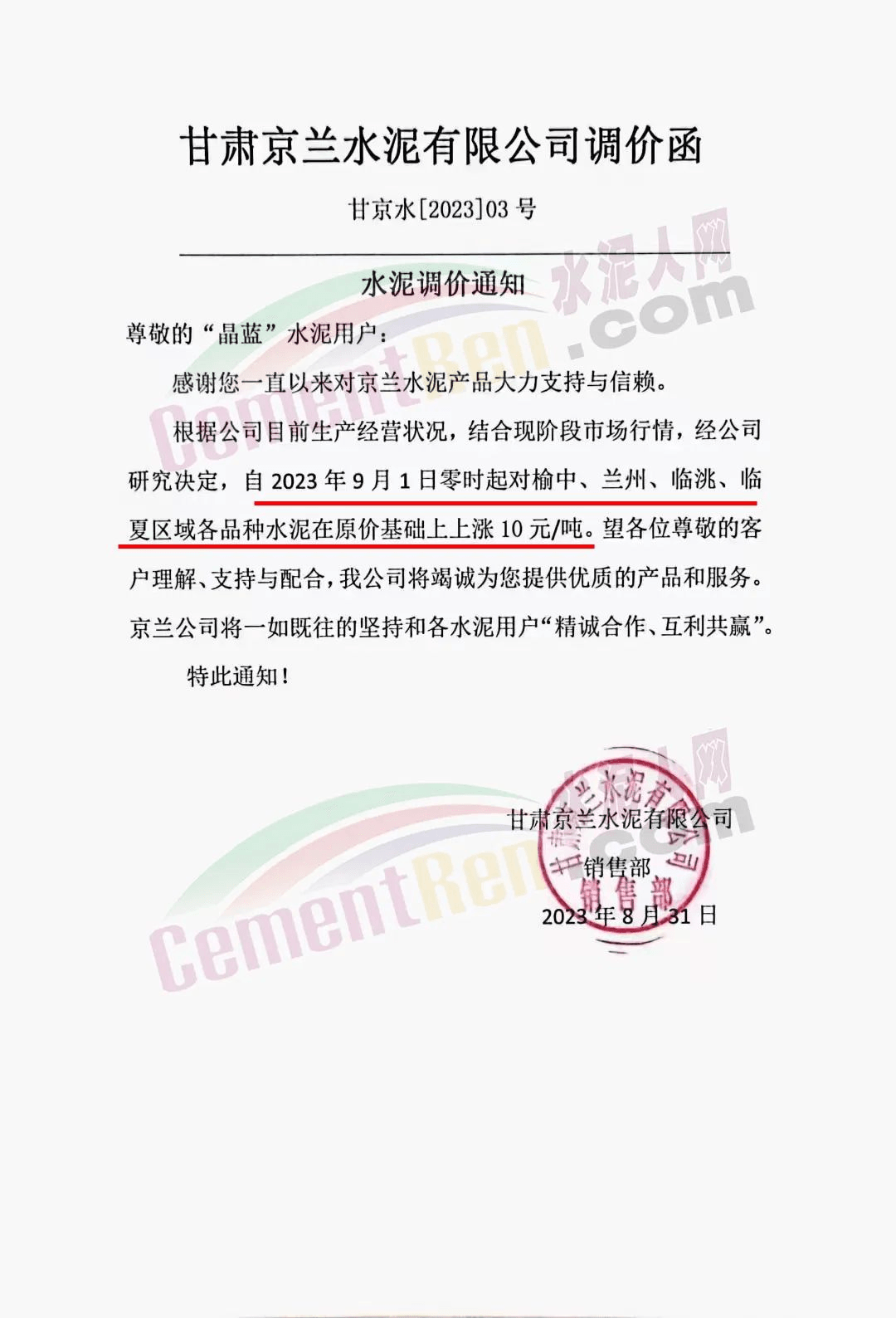 甘肅區(qū)域臨夏海螺水泥、甘肅京蘭水泥、三易水泥、中材甘肅水泥以及祁連山水泥天水公司、蘭州公司等主要品牌企業(yè)通知上調(diào)水泥價(jià)格10元/噸。