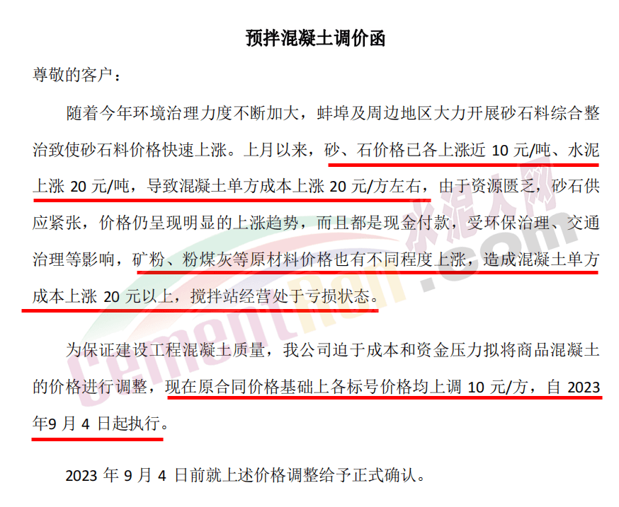 為保證建設(shè)工程混凝土質(zhì)量,公司迫于成本和資金壓力擬將商品混凝土的價(jià)格進(jìn)行調(diào)整,自2023年9月4日起在原合同價(jià)格基礎(chǔ)上各標(biāo)號(hào)價(jià)格上調(diào)10元/方。