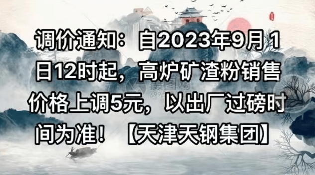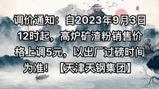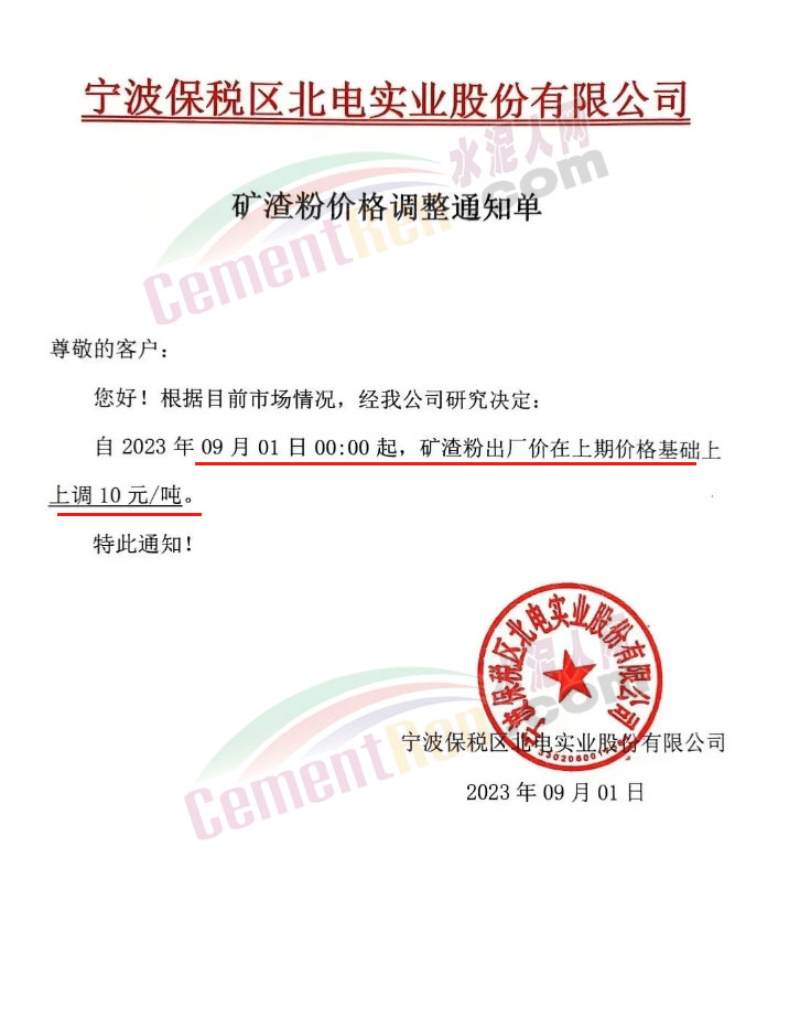 浙江寧波保稅區(qū)北電實(shí)業(yè)股份有限公司通知,根據(jù)目前市場(chǎng)情況,經(jīng)公司研究決定:自9月1日0時(shí)起,礦渣粉出廠價(jià)在上期價(jià)格基礎(chǔ)上上調(diào)10元/噸,上調(diào)后礦粉現(xiàn)金掛牌價(jià)210元/噸。