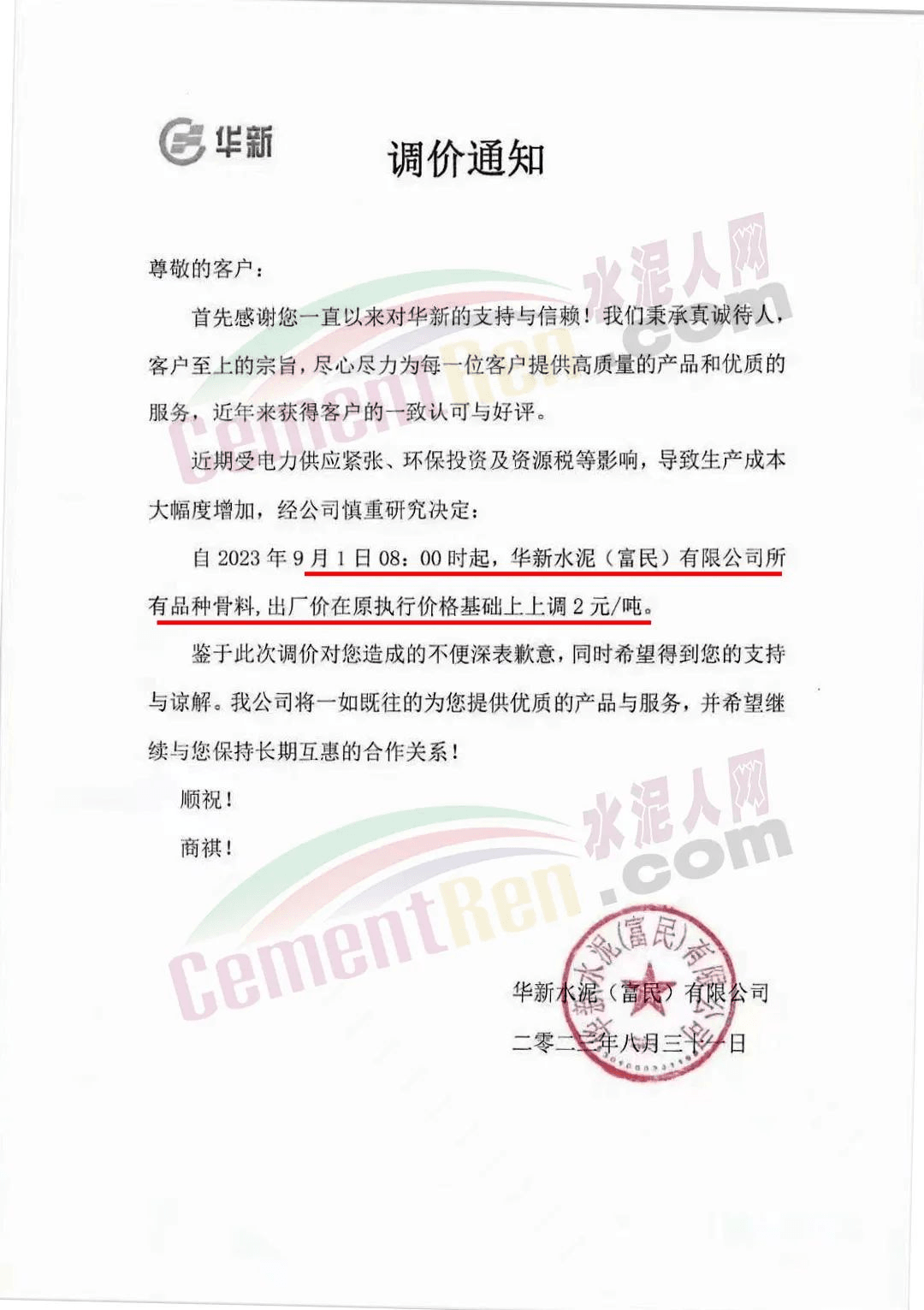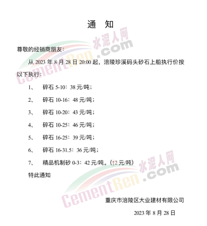 華新水泥(富民)有限公司通知稱,受電力供應(yīng)緊張、環(huán)保投資及資源稅等影響,導(dǎo)致生產(chǎn)成本大幅度增加,經(jīng)公司慎重研究決定:自2023年9月1日8時(shí)起,公司所有品種骨料出廠價(jià)在原執(zhí)行價(jià)格基礎(chǔ)上上調(diào)2元/噸。