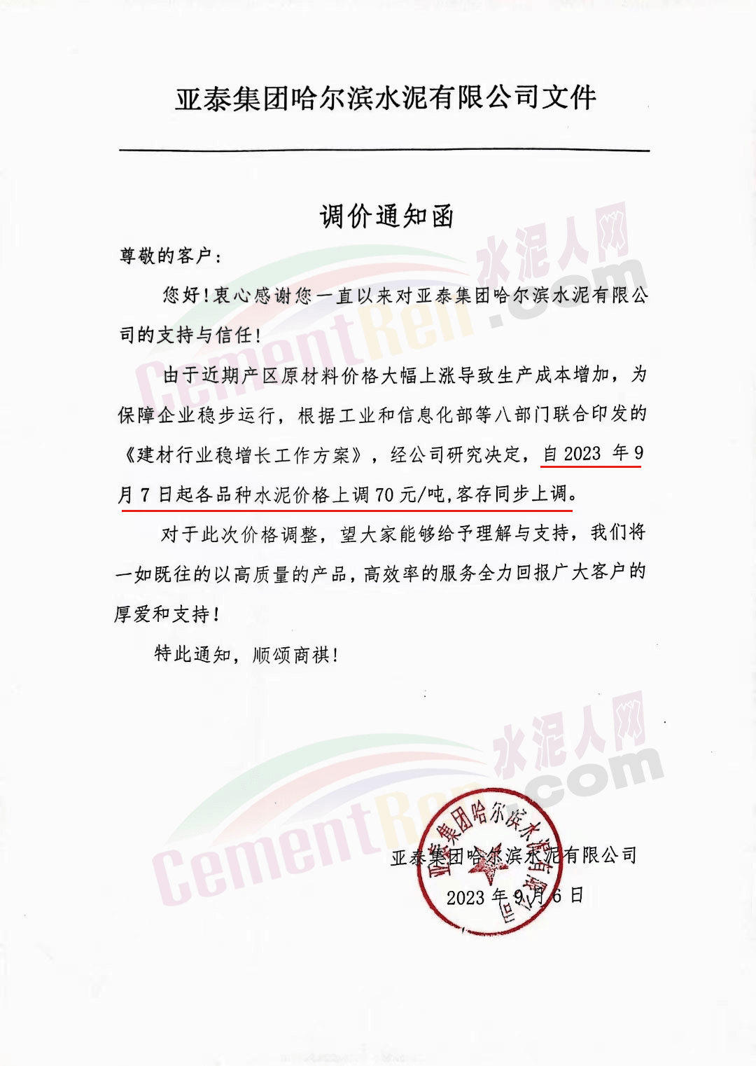 日前,亞泰集團哈爾濱水泥有限公司通知,由于近期產(chǎn)區(qū)原材料價格大幅上漲導(dǎo)致生產(chǎn)成本增加,為保障企業(yè)穩(wěn)步運行,根據(jù)工業(yè)和信息化部等八部門聯(lián)合印發(fā)的《建材行業(yè)穩(wěn)增長工作方案》,經(jīng)公司研究決定,自2023年9月7日起各品種水泥價格上調(diào)70元/噸,客存同步上調(diào)。