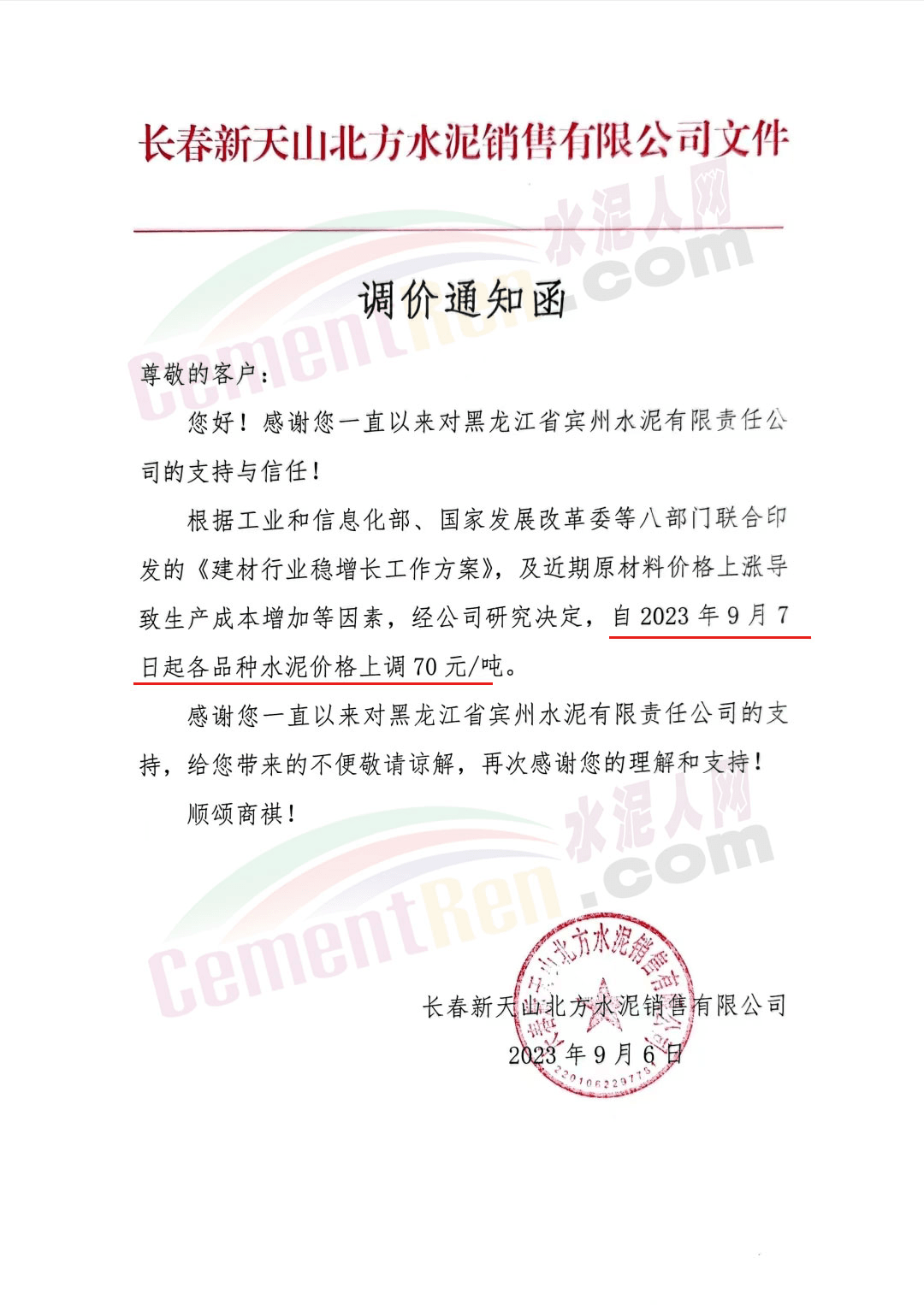 長春新天山北方水泥銷售有限公司通知,根據(jù)工業(yè)和信息化部、國家發(fā)展改革委等八部門聯(lián)合印發(fā)的《建材行業(yè)穩(wěn)增長工作方案》,及近期原材料價格上漲導(dǎo)致生產(chǎn)成本增加等因素,經(jīng)公司研究決定,自2023年9月7日起各品種水泥價格上調(diào)70元/噸。