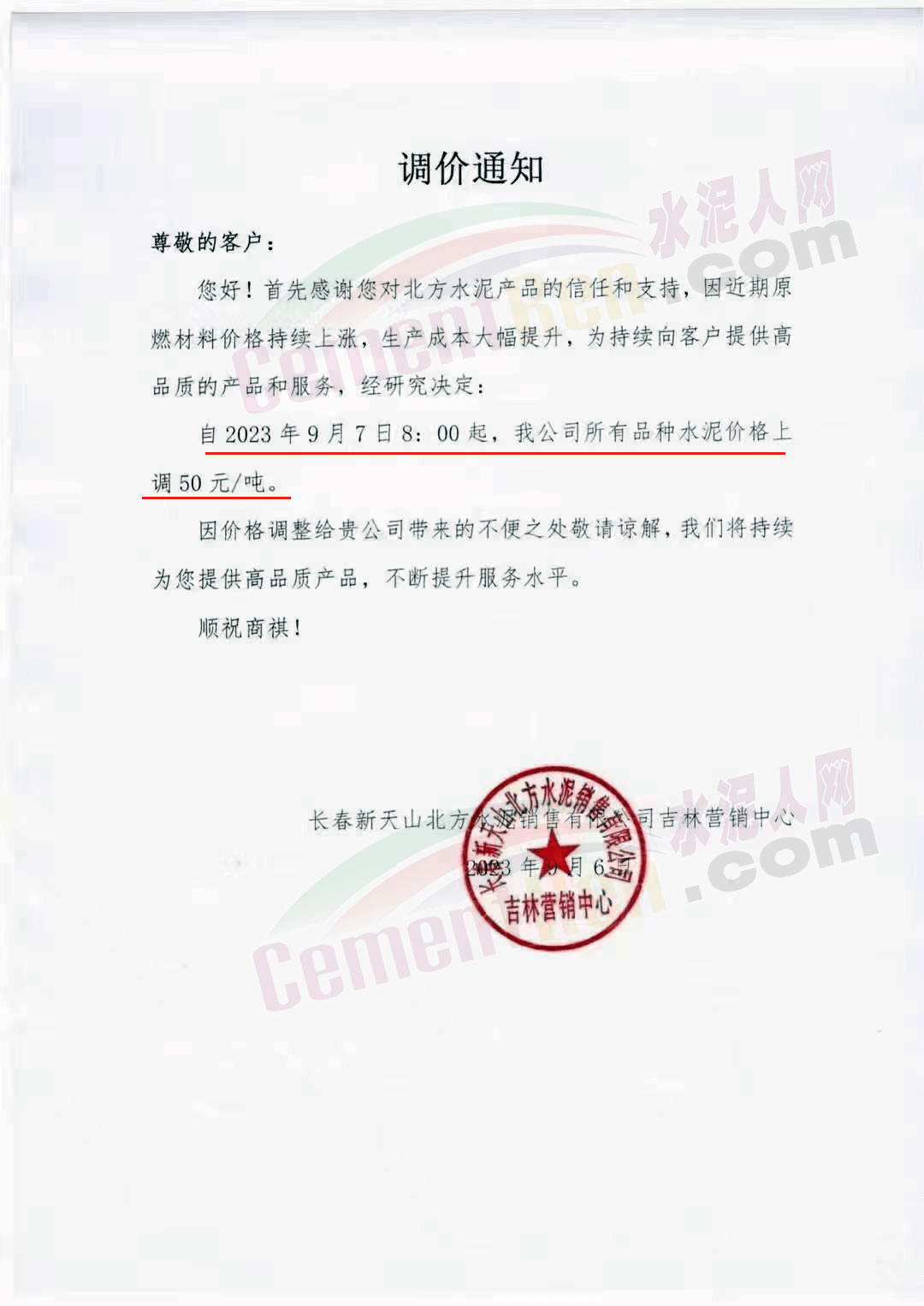 長春新天山北方水泥銷售有限公司吉林營銷中心通知,因近期原燃材料價格持續(xù)上漲,生產(chǎn)成本大幅提升,為持續(xù)向客戶提供高品質(zhì)的產(chǎn)品和服務(wù),經(jīng)研究決定:自2023年9月7日8時起,公司所有品種水泥價格上調(diào)50元/噸。