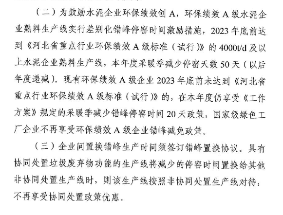 在2023年底前達(dá)A級標(biāo)準(zhǔn)的企業(yè)不僅要停窯,而且減免措施僅限擁有4000t/d及以上企業(yè);國家級綠色工廠不再享受錯峰減免政策。調(diào)整錯峰生產(chǎn)時間和保民生的協(xié)同處置項目也必須在規(guī)定的時間段內(nèi)補(bǔ)齊等。