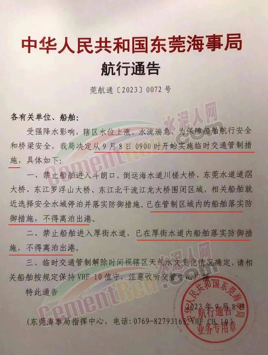 因暴雨、臺風(fēng)影響,華南多地大宗物流停限運(yùn),施工工地及攪拌站停工停產(chǎn),水泥發(fā)運(yùn)量近零。水運(yùn)物流方面,海事局發(fā)布臨時交通管制措施管制區(qū)內(nèi)船舶禁止進(jìn)入,已進(jìn)入船舶不得離泊出港。