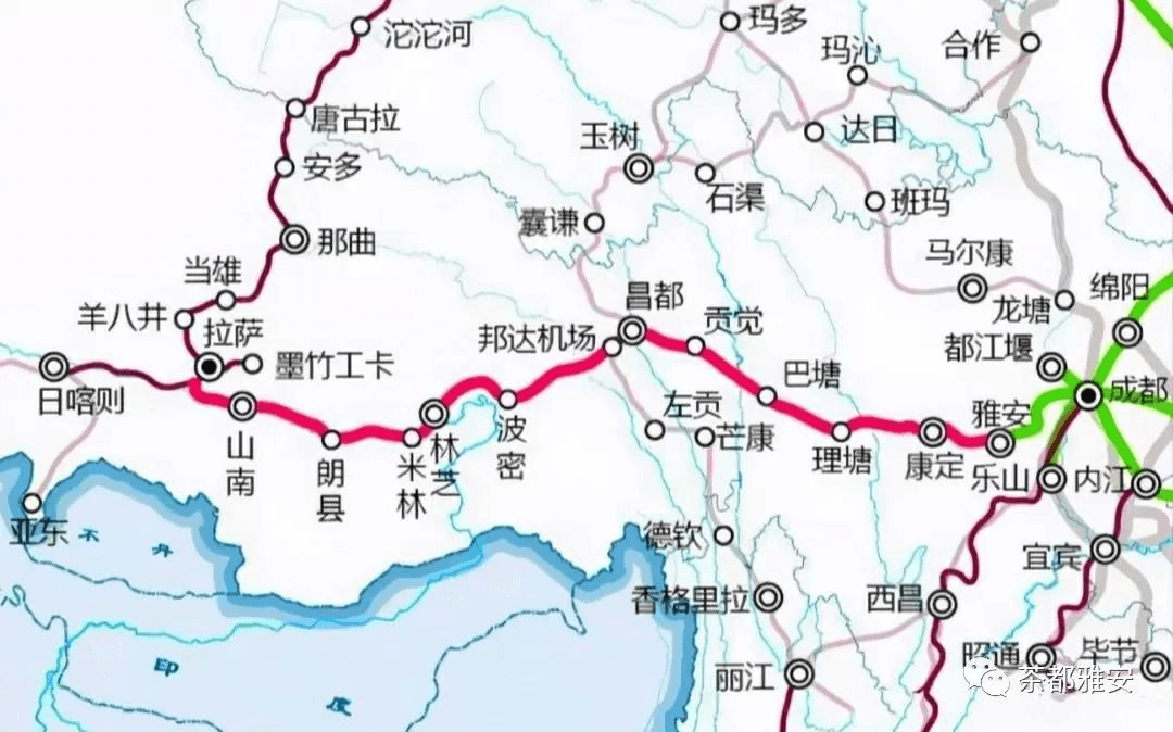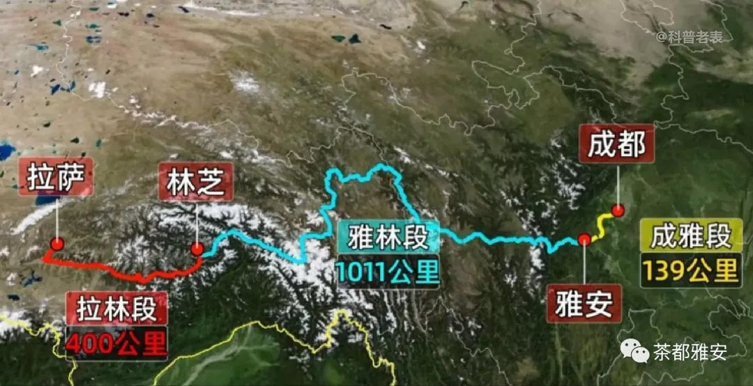 川藏鐵路從成都到拉薩,可以分成三段來看。成都到雅安的成雅段,長(zhǎng)140公里,雅安到林芝的雅林段,長(zhǎng)1010公里,拉薩到林芝的拉林段,長(zhǎng)400公里。成雅段和拉林段已建成通車,剩下中間的雅林段于2020年11月初開工建設(shè),工期預(yù)計(jì)為10年,2032年左右雅林段將全線通車,設(shè)計(jì)時(shí)速為120~200公里/小時(shí)。