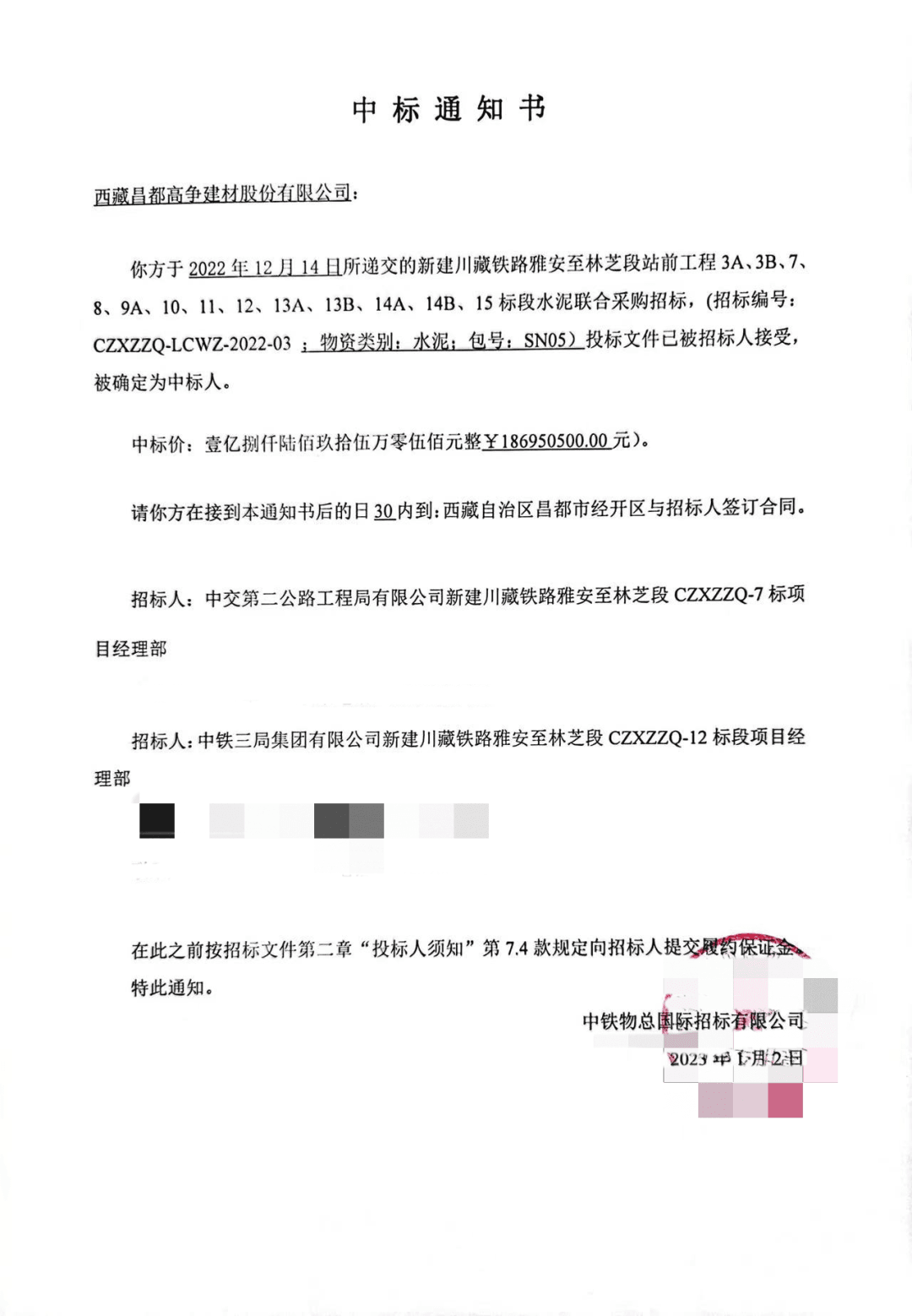 最終,在黨委書記、董事長(zhǎng)和領(lǐng)導(dǎo)班子的正確決策、大力支持和各部門的精誠團(tuán)結(jié)、全力配合之下,昌都高爭(zhēng)憑借扎實(shí)的服務(wù)態(tài)度和良好的社會(huì)信譽(yù)在激烈的競(jìng)爭(zhēng)中脫穎而出,順利中標(biāo)川藏鐵路雅安至林芝段工程水泥采購項(xiàng)目,成功獲得水泥供應(yīng)權(quán),中標(biāo)量28萬噸,中標(biāo)金額約1.87億元。