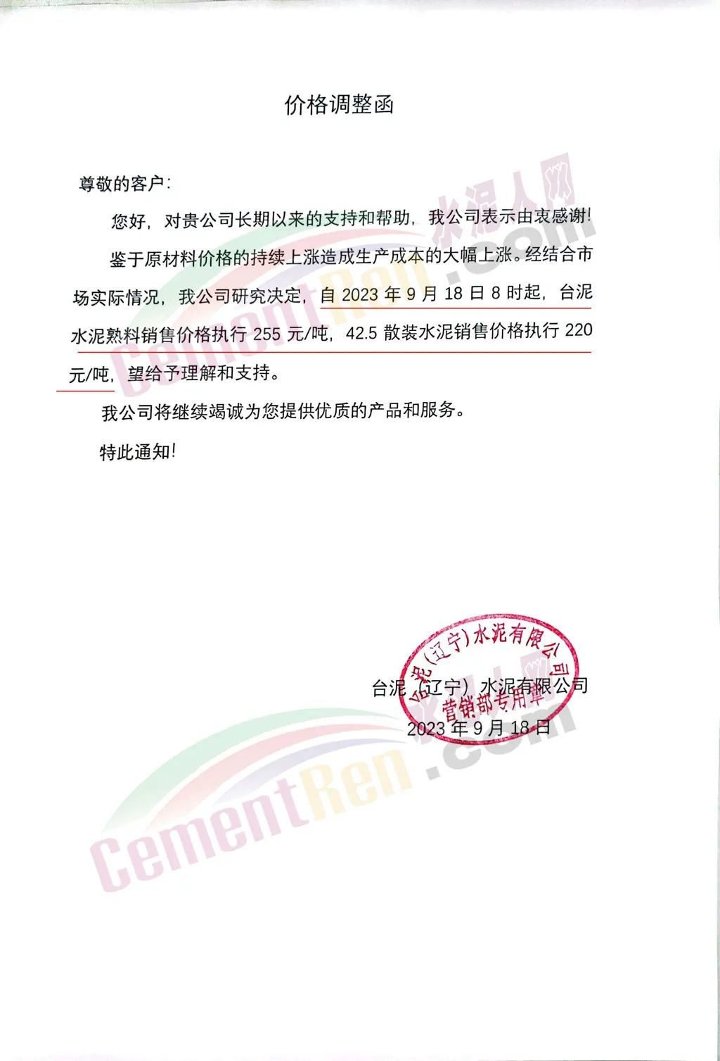 臺泥(遼寧)水泥有限公司通知,鑒于原材料價格的持續(xù)上漲造成生產成本的大幅上漲。經結合市場實際情況,公司研究決定,自2023年9月18日8時起,臺泥水泥熟料銷售價格執(zhí)行255元/噸,42.5散裝水泥銷售價格執(zhí)行220元/噸。