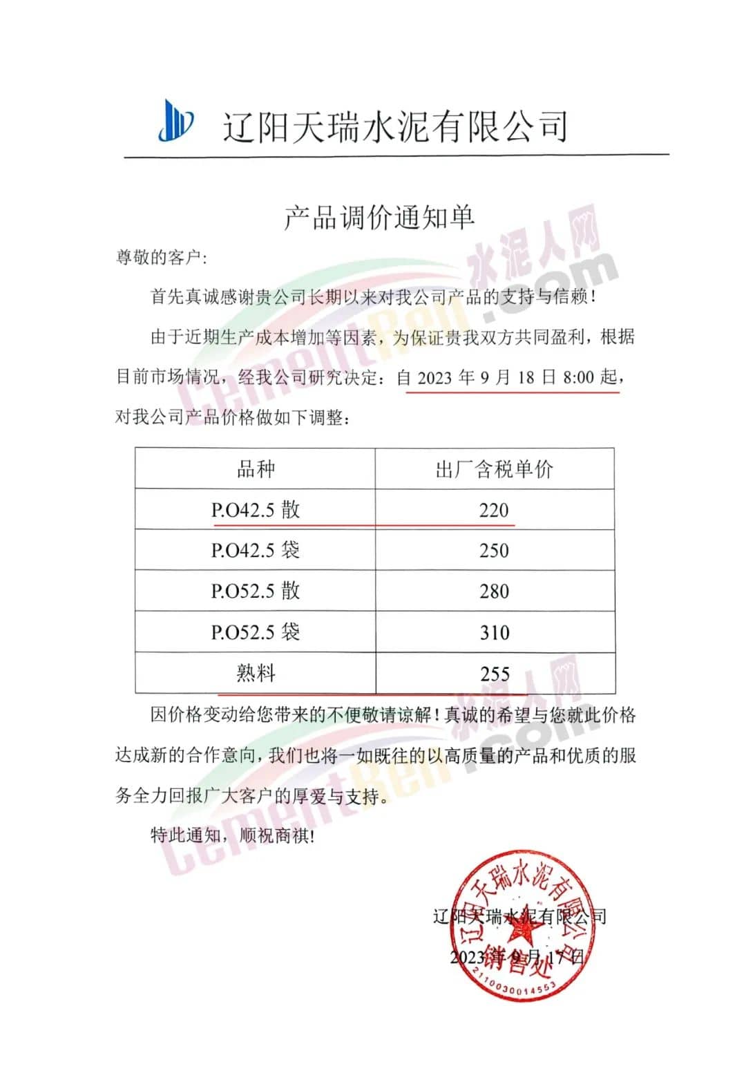 遼陽天瑞水泥有限公司通知,由于近期生產成本增加等因素,根據(jù)目前市場情況,經公司研究決定:自2023年9月18日8:00起執(zhí)行新報價。其中P.O42.5散裝水泥出廠含稅報價220元/噸。熟料報價255元/噸。