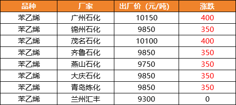 9月以來,苯乙烯漲超1000元/噸,期貨市場日內(nèi)大漲3.45%,多家化工企業(yè)苯乙烯出廠價(jià)大漲350-400元/噸,廣州石化和茂名石化出廠價(jià)已漲破10000元/噸。