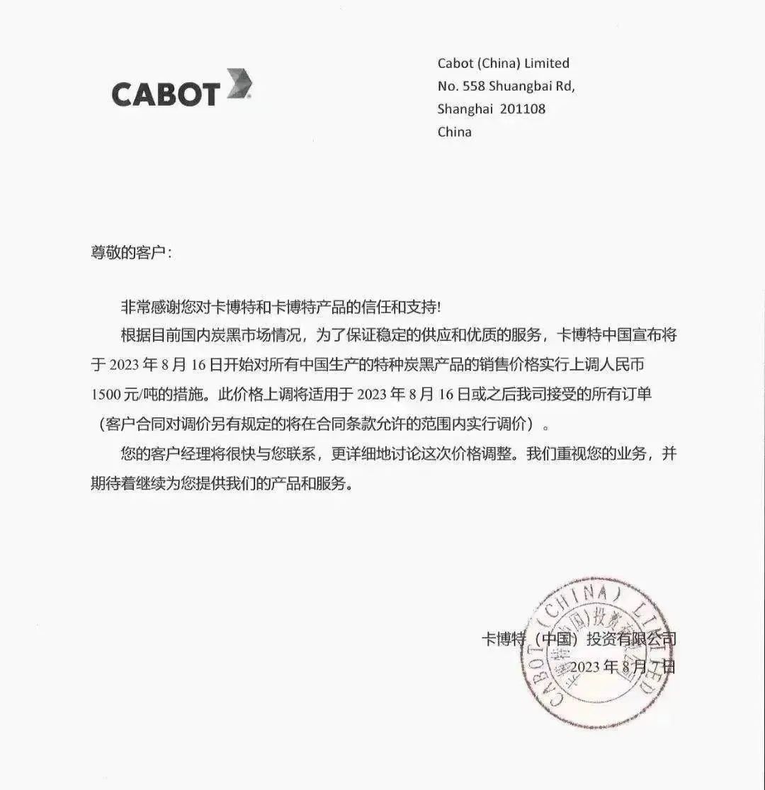 8月份開始,炭黑價(jià)格觸底反彈。目前橡膠用炭黑價(jià)格已經(jīng)突破一萬大關(guān),且還呈現(xiàn)往上飆升的態(tài)勢。2023年9月15日炭黑價(jià)格為11000元/噸左右,并且還有繼續(xù)上漲之勢。炭黑龍頭卡博特宣布對(duì)所有中國生產(chǎn)的特種炭黑產(chǎn)品的銷售價(jià)格實(shí)行上調(diào)人民幣1500元/噸。