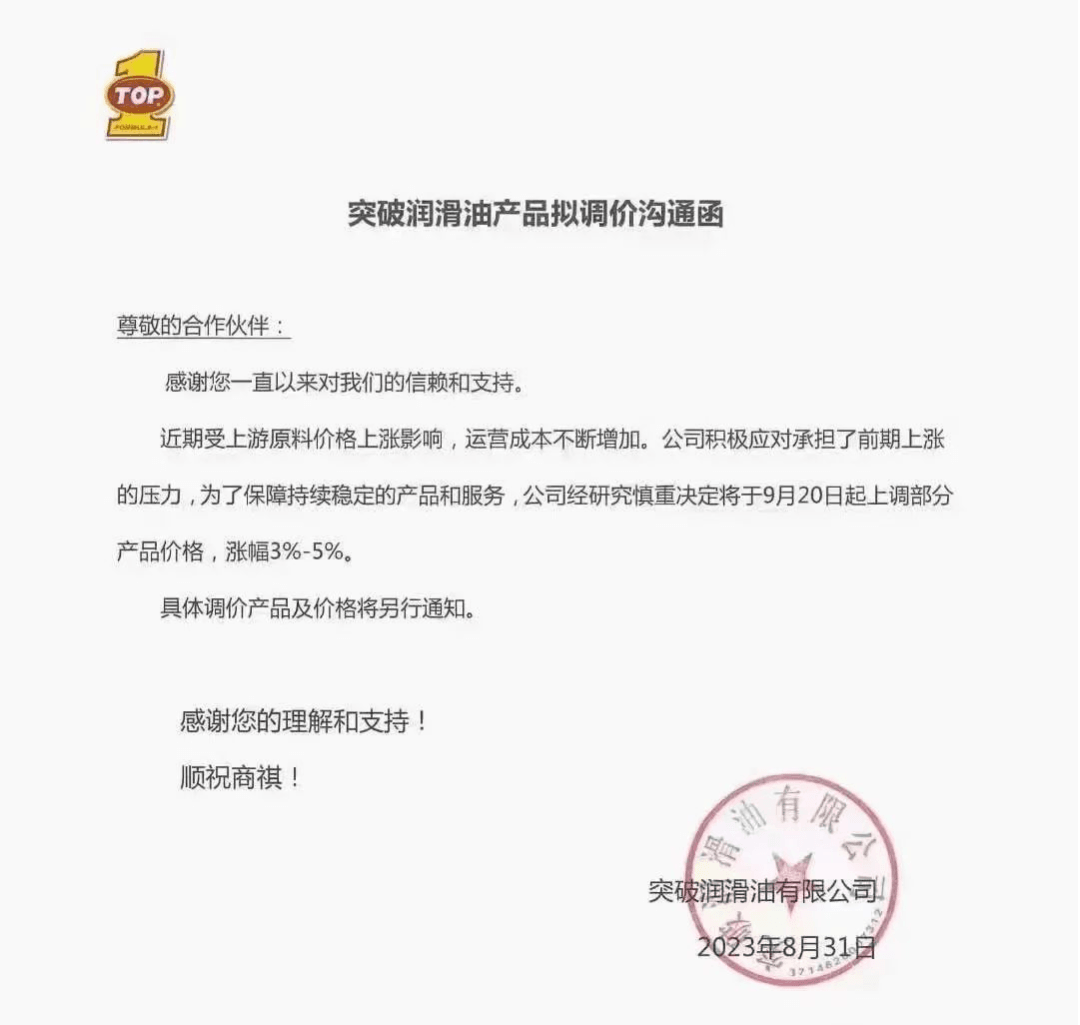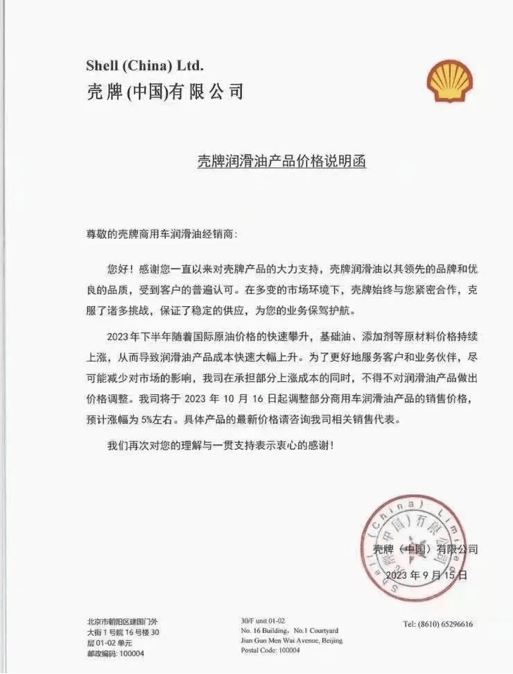 近日,勝牌、殼牌和突破潤滑油發(fā)布了關(guān)于調(diào)整潤滑油產(chǎn)品價(jià)格通告,宣布對(duì)產(chǎn)品價(jià)格進(jìn)行適度上調(diào),預(yù)計(jì)漲幅為5%左右。
