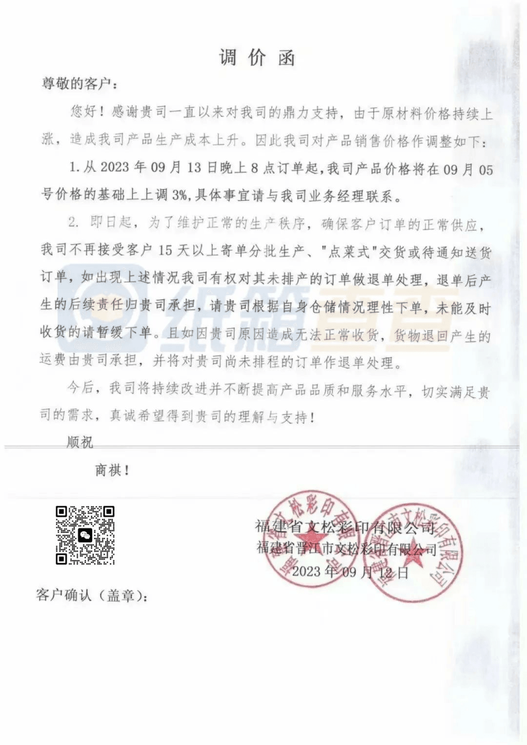 聚隆(福建)包裝:從2023年9月13日20:00的訂單起,將在9月7日價(jià)格基礎(chǔ)上上調(diào)3%。