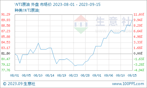 沙特持續(xù)減產(chǎn),今年第四季度全球石油市場將面臨每天超過300萬桶的供應(yīng)缺口,9月14日,國際原油期貨上漲,漲幅明顯。美國WTI原油期貨主力合約結(jié)算價(jià)報(bào)90.16美元/桶,漲幅1.64美元或1.9%。今年WTI首次站上90美元關(guān)口,創(chuàng)2022年11月以來新高。8月23日以來,WTI原油價(jià)格階段性大漲14.4%。