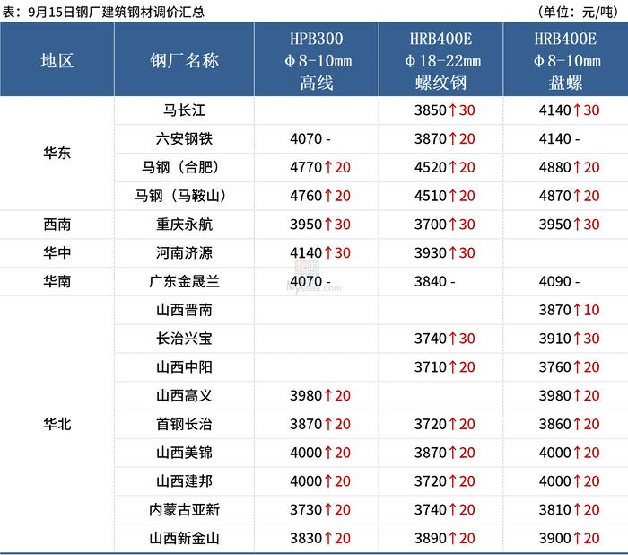 上周五(9月15日),全國累計(jì)15家鋼廠發(fā)布調(diào)價(jià)信息,其中14家鋼廠漲價(jià),整體調(diào)幅在0-30元/噸。