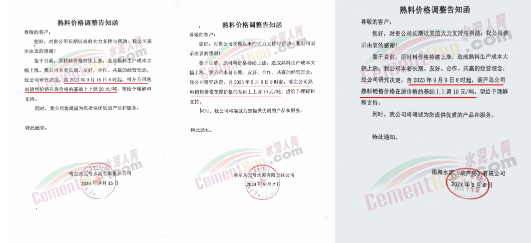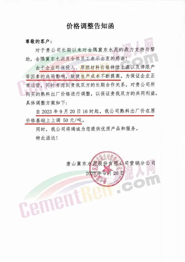 唐山冀東水泥股份有限公司營(yíng)銷(xiāo)分公司通知,由于企業(yè)環(huán)保投入、原燃材料價(jià)格持續(xù)上漲以及停限產(chǎn)等因素的共同影響,致使生產(chǎn)成本不斷提高。為保證企業(yè)正常運(yùn)營(yíng),自2023年9月20日16時(shí)起,熟料出廠價(jià)在原價(jià)格基礎(chǔ)上上調(diào)50元/噸。