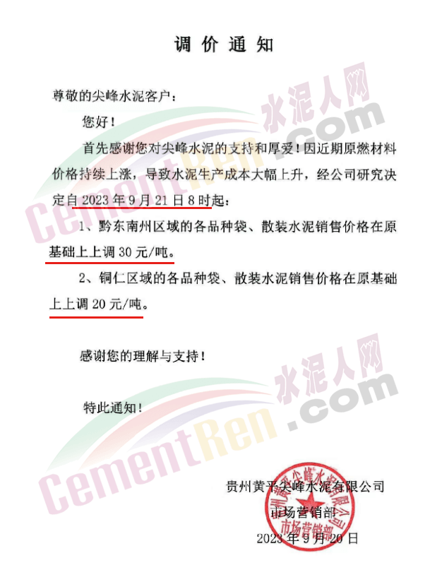 貴州黃平尖峰水泥通知,因近期原燃材料價(jià)格持續(xù)上漲,導(dǎo)致水泥生產(chǎn)成本大幅上升,經(jīng)公司研究決定自2023年9月21日8時(shí)起,黔東南州區(qū)域的各品種袋、散裝水泥銷(xiāo)售價(jià)格在原基礎(chǔ)上上調(diào)30元/噸。銅仁區(qū)域的各品種袋、散裝水泥銷(xiāo)售價(jià)格在原基礎(chǔ)上上調(diào)20元/噸。