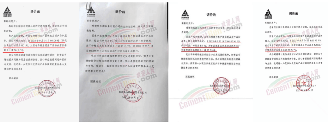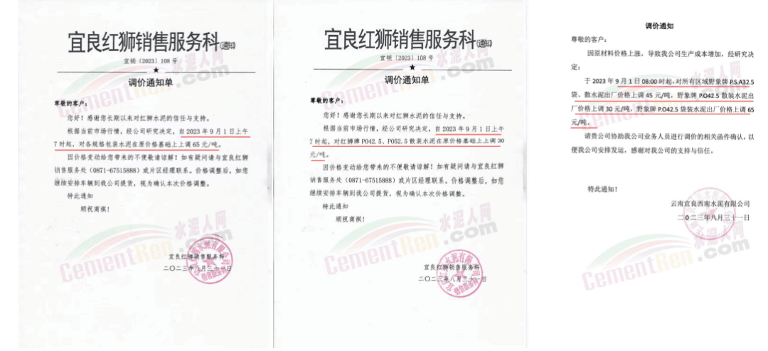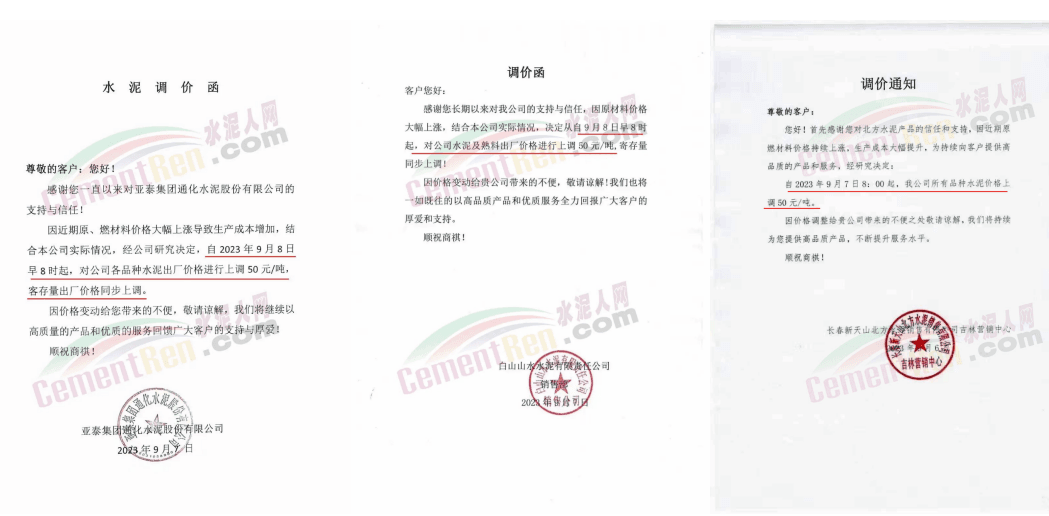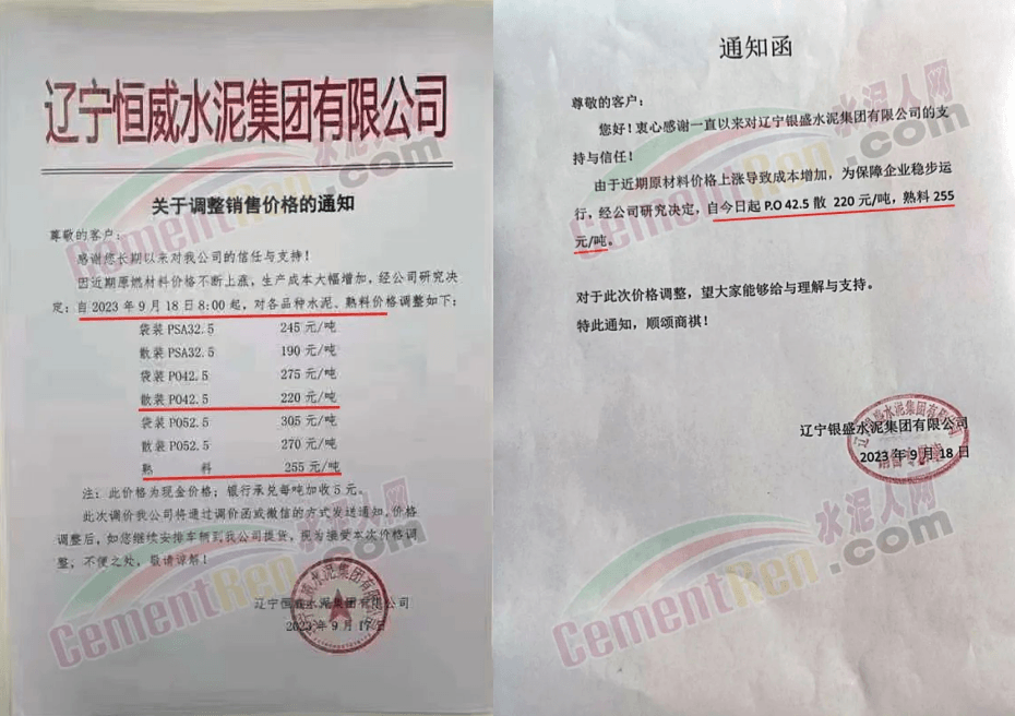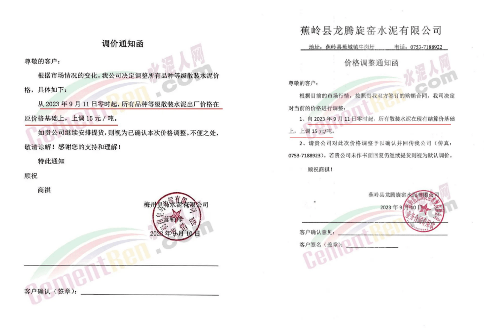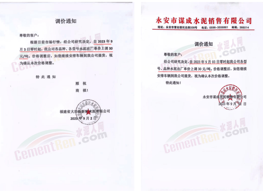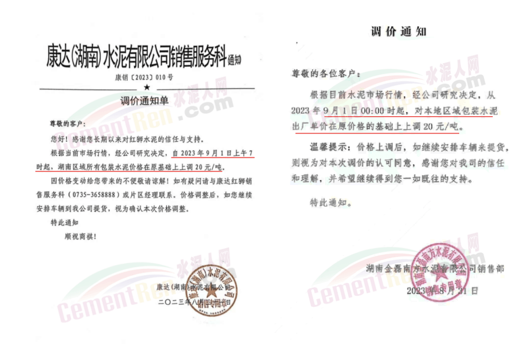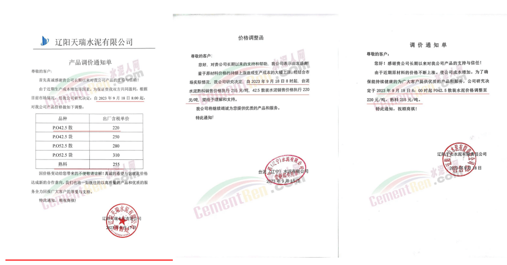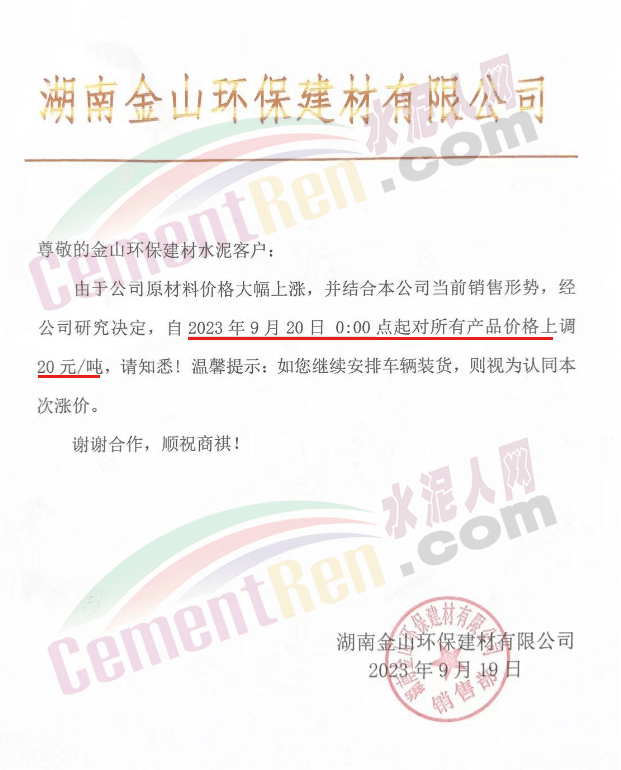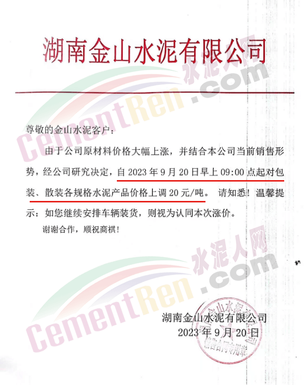 華新水泥(宜昌)公司、葛洲壩松滋水泥通知,因公司生產(chǎn)成本持續(xù)上漲,市場(chǎng)行情發(fā)生變化,經(jīng)公司研究決定于2023年9月20日17:00起,所有品種水泥價(jià)格上調(diào)20元/噸。