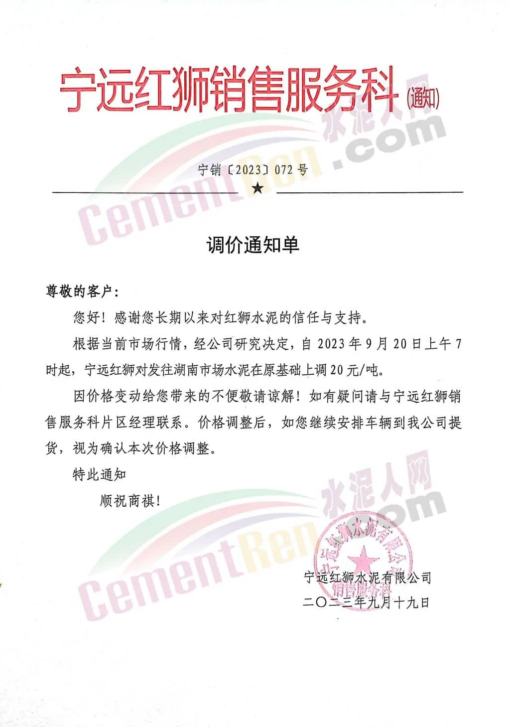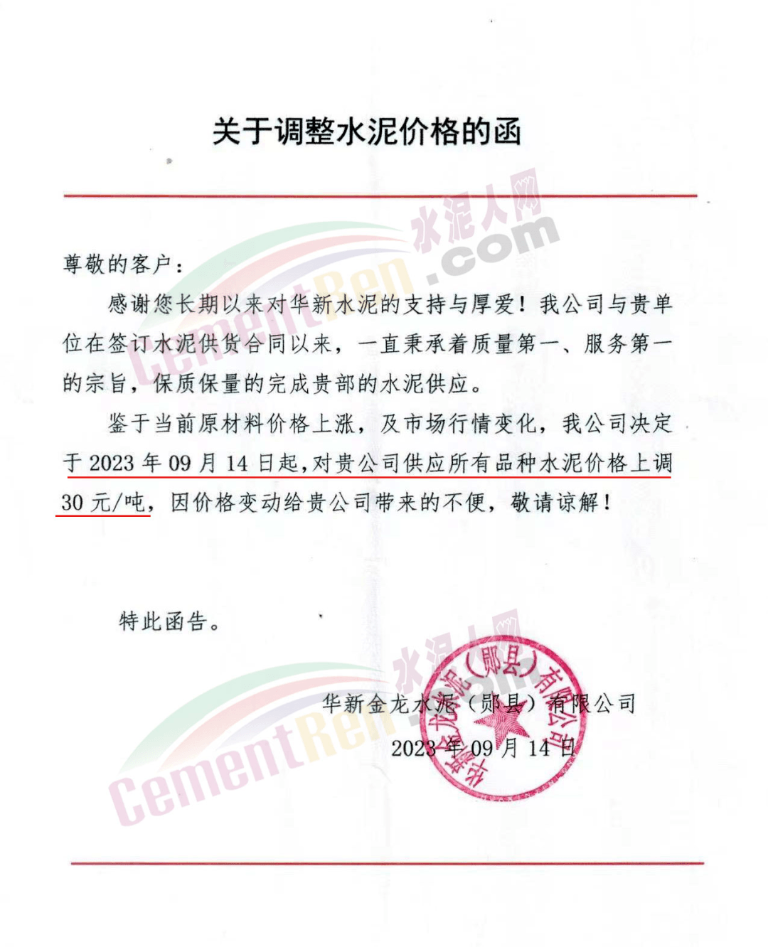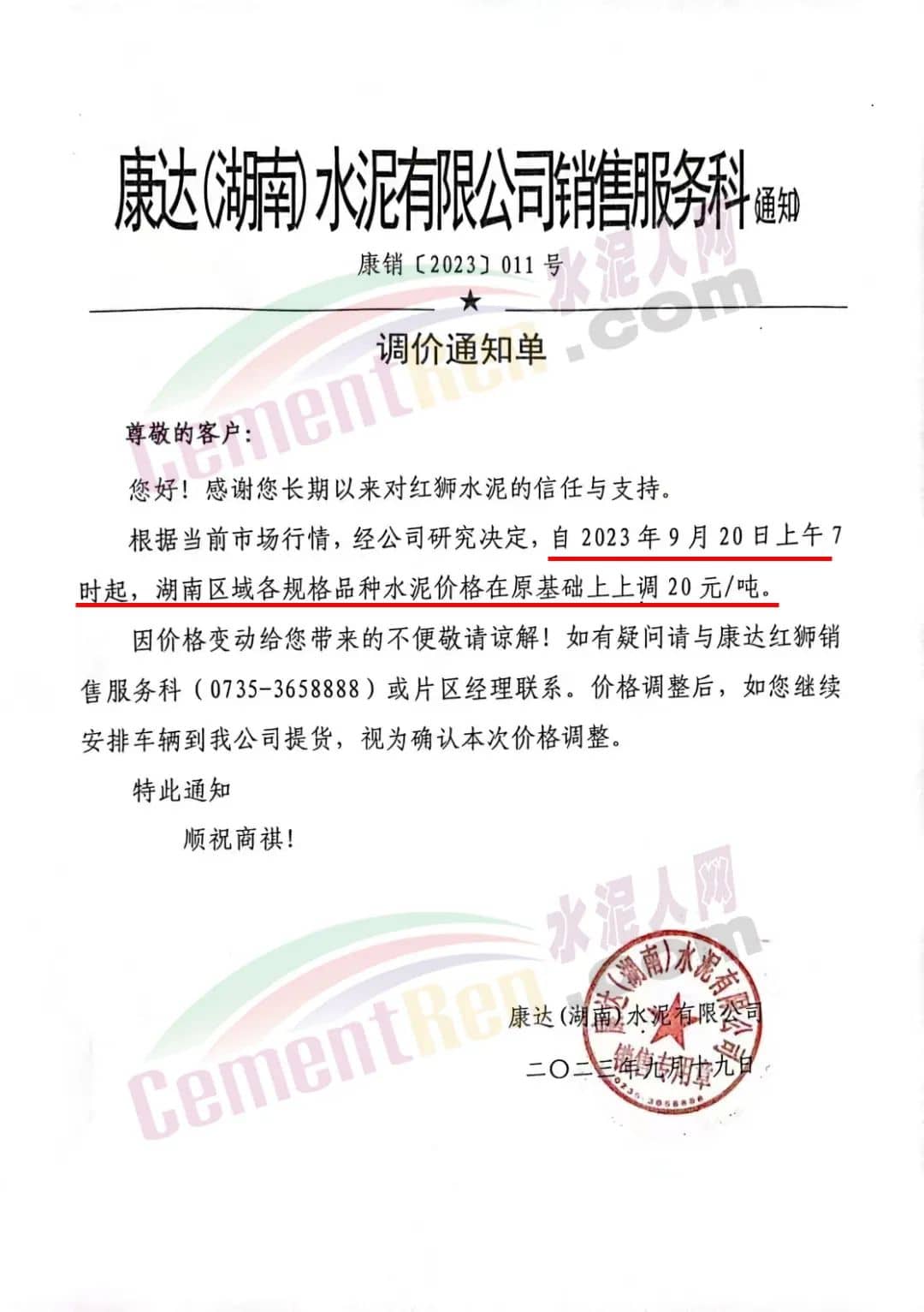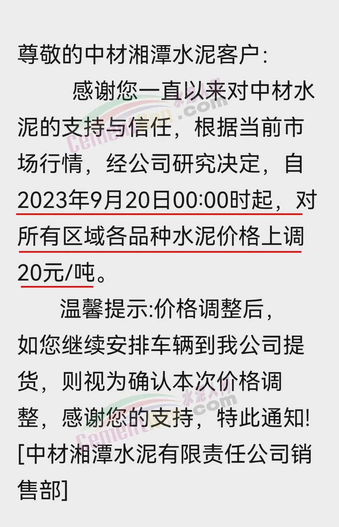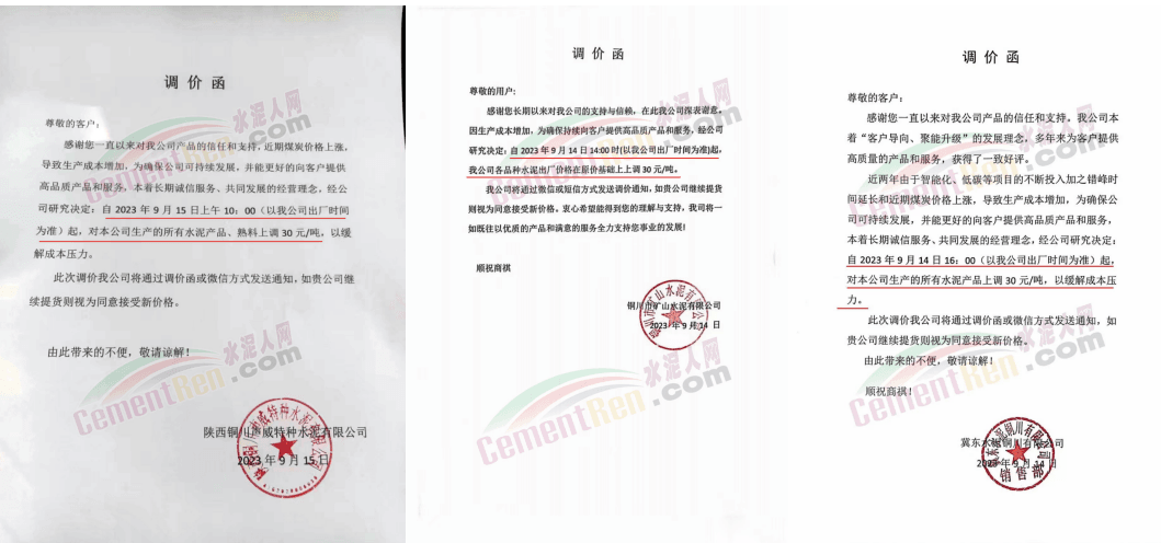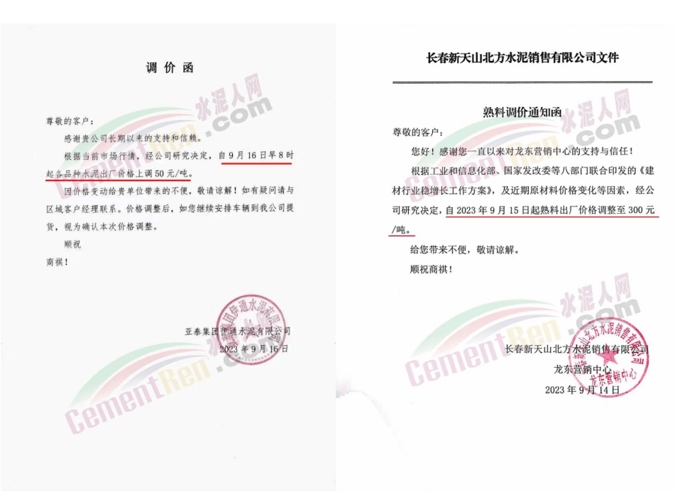 華新水泥(宜昌)公司、葛洲壩松滋水泥通知,因公司生產(chǎn)成本持續(xù)上漲,市場(chǎng)行情發(fā)生變化,經(jīng)公司研究決定于2023年9月20日17:00起,所有品種水泥價(jià)格上調(diào)20元/噸。