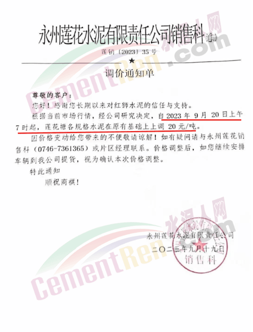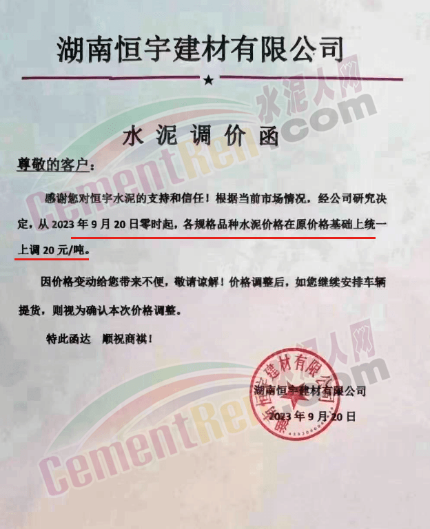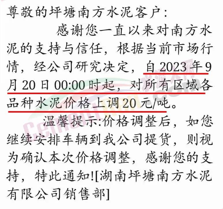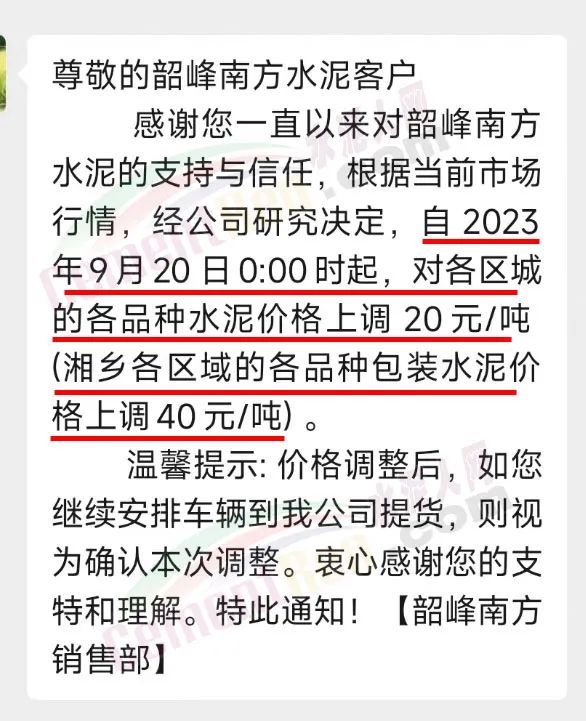 中南水泥旗下耒陽(yáng)南方、寧鄉(xiāng)南方、瀏陽(yáng)南方、桃江南方、坪塘南方、韶峰南方、中材湘潭水泥等多家企業(yè)通知,根據(jù)當(dāng)前市場(chǎng)行情,經(jīng)公司研究決定,從2023年9月20日0時(shí)起,對(duì)各區(qū)域、各品種的水泥出廠價(jià)在原基礎(chǔ)上上調(diào)20~40元/噸。